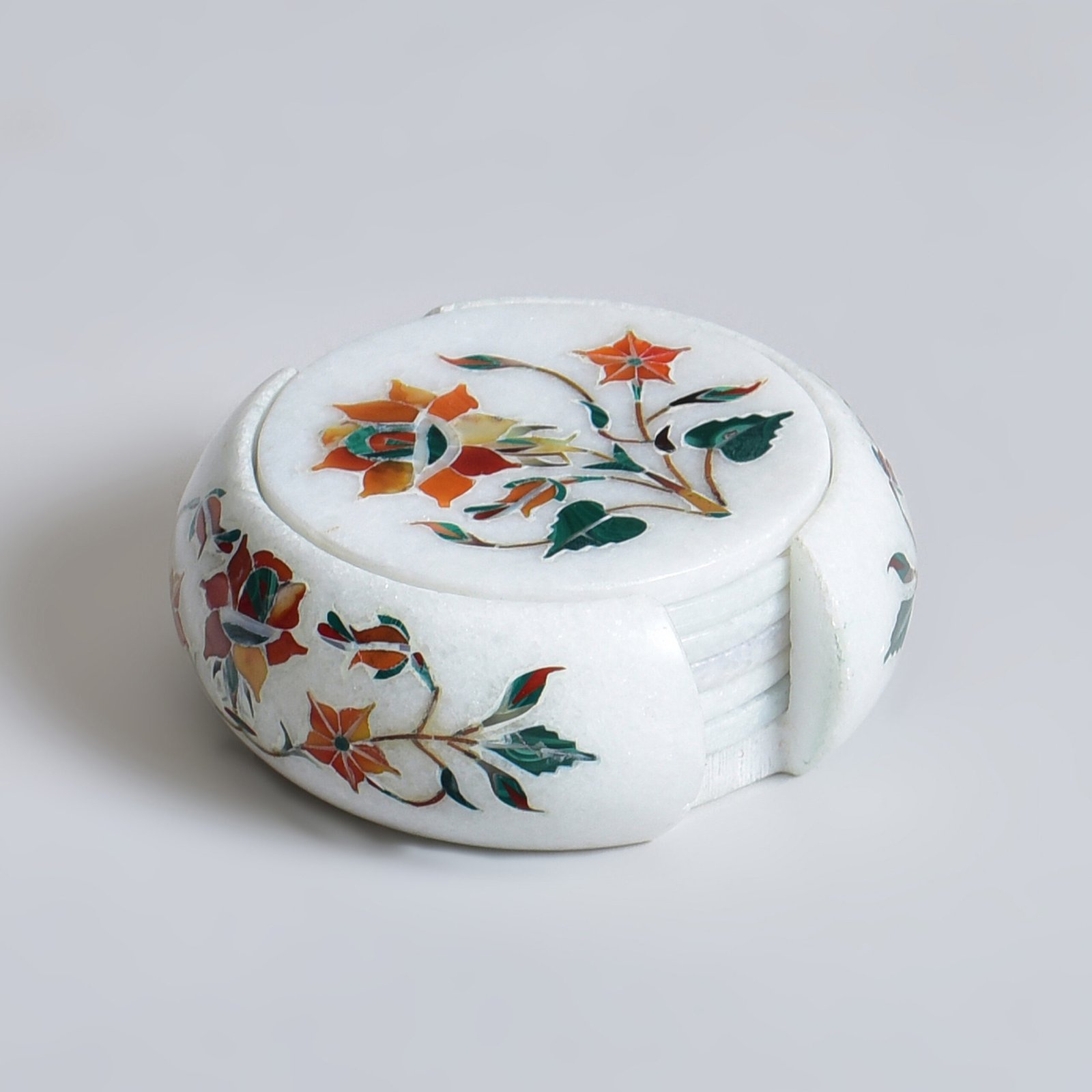 A quiet garden, forever in bloom. This handcrafted marble coaster set transforms your table into a serene sanctuary, where delicate floral motifs come alive through the intricate artistry of the Parchinkari inlay technique. Each petal is meticulously set with semi-precious stones that glimmer like morning dew resting gently on soft leaves.