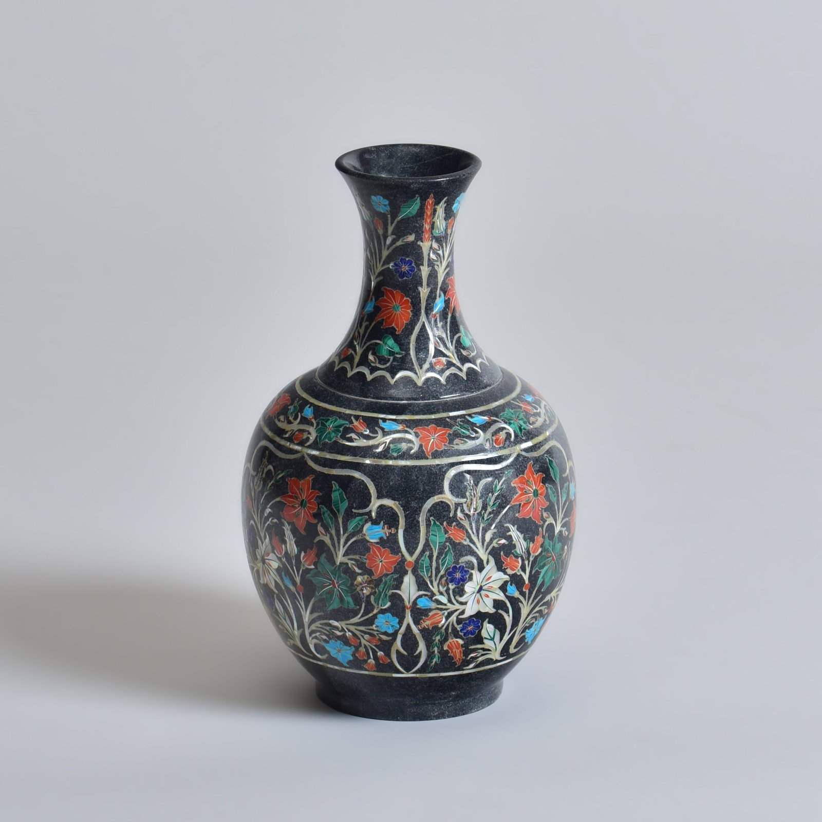 This black marble vase is the result of practiced patience. Each floral inlay is set by hand, using the Parchinkari technique, an art form that demands precision and care. Semi-precious stones are shaped and nestled into the deep, polished stone surface, creating a quiet contrast of color and texture. There is weight in its presence, but also softness in its details. Made over weeks, never rushed, this piece holds the rhythm of traditional craft in a contemporary form.