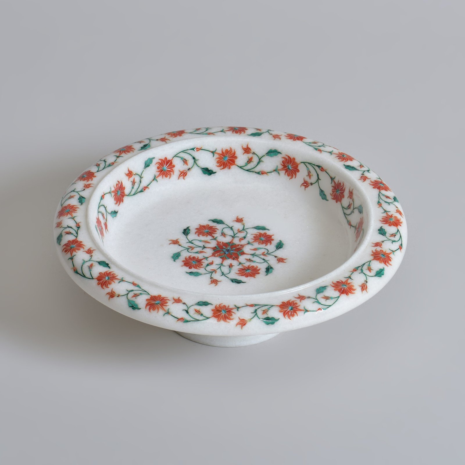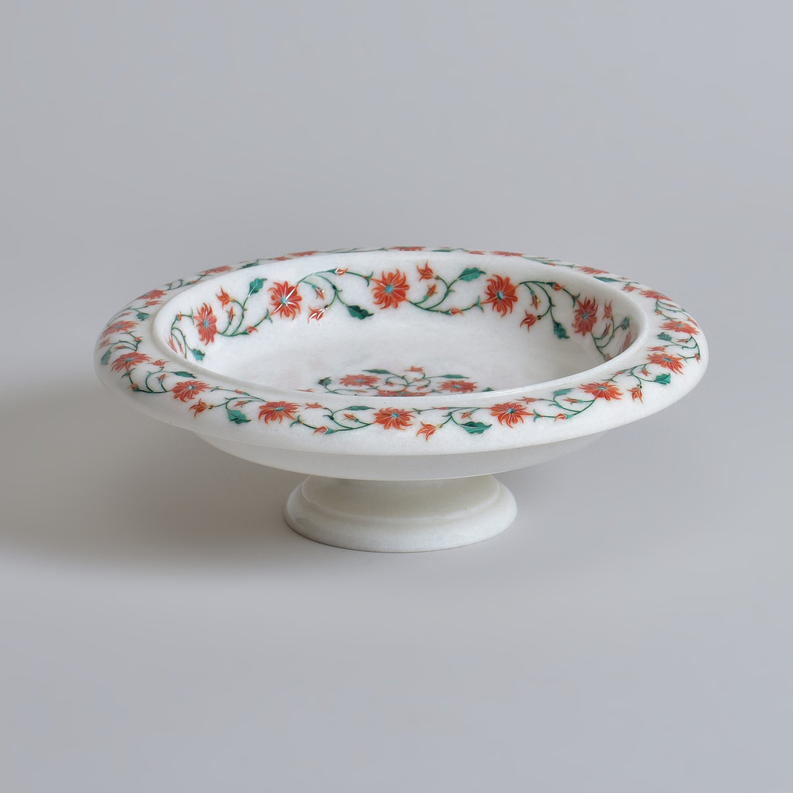 This bowl belongs in a story passed from one generation to the next. Its white marble base is a canvas for florals carefully inlaid with semi-precious stones, using a heritage craft that takes years to master. When placed in your home, it brings with it a sense of continuity, between the past and present, between tradition and design.