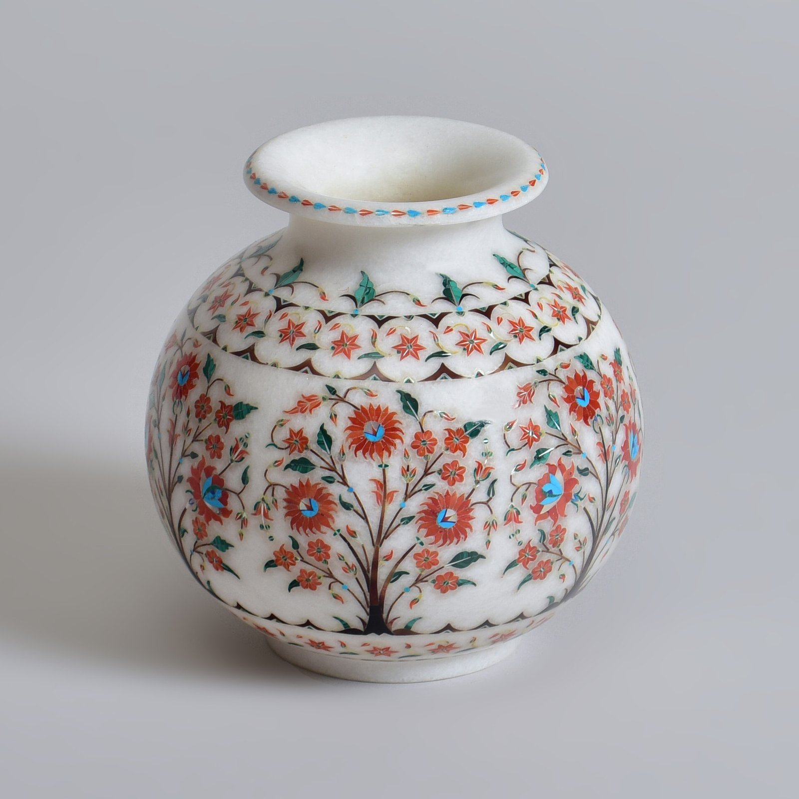 There’s a luminous stillness to white marble. This vase captures it fully. As light moves across your room, the surface shifts from cool glow to warm shimmer, highlighting each hand-set floral inlay. Crafted with semi-precious stones using the Parchinkari technique, the design is delicate but never fragile, rooted in centuries-old craftsmanship. Its palette is soft, its form simple, yet the impact is quietly stunning.