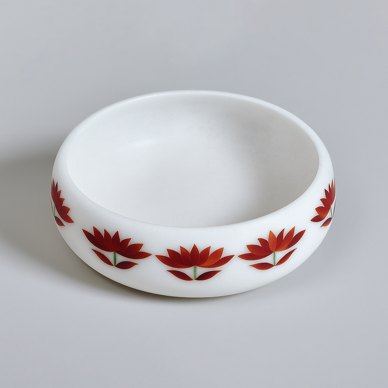 Graceful and timeless, this white marble bowl is a testament to understated luxury. Its smooth surface, hand-carved from pristine marble, becomes the perfect canvas for delicate red floral motifs that bloom like whispers of elegance. Each detail is thoughtfully crafted, creating a striking contrast that feels both classic and contemporary. More than a functional piece, it serves as a work of art, ideal for styling coffee tables, consoles, or dining spaces. Whether holding treasures or standing alone, this bowl elevates interiors with its quiet sophistication and artistic charm.