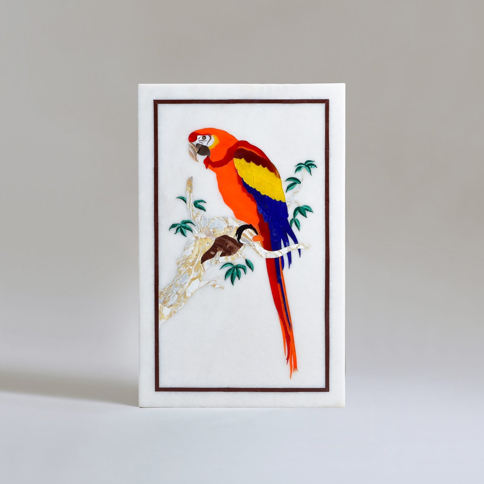 Perched in stillness yet brimming with life, this exquisite Marble Wall Art captures a red parrot resting gracefully on a branch, its feathers ablaze with the vibrancy of hand-inlaid semi-precious stones. Crafted in the centuries-old Parchinkari technique, the white marble canvas offers a timeless contrast to the vivid artistry. This piece is not merely décor; it’s a whisper of the wild, a splash of exotic elegance, and a celebration of meticulous craftsmanship.