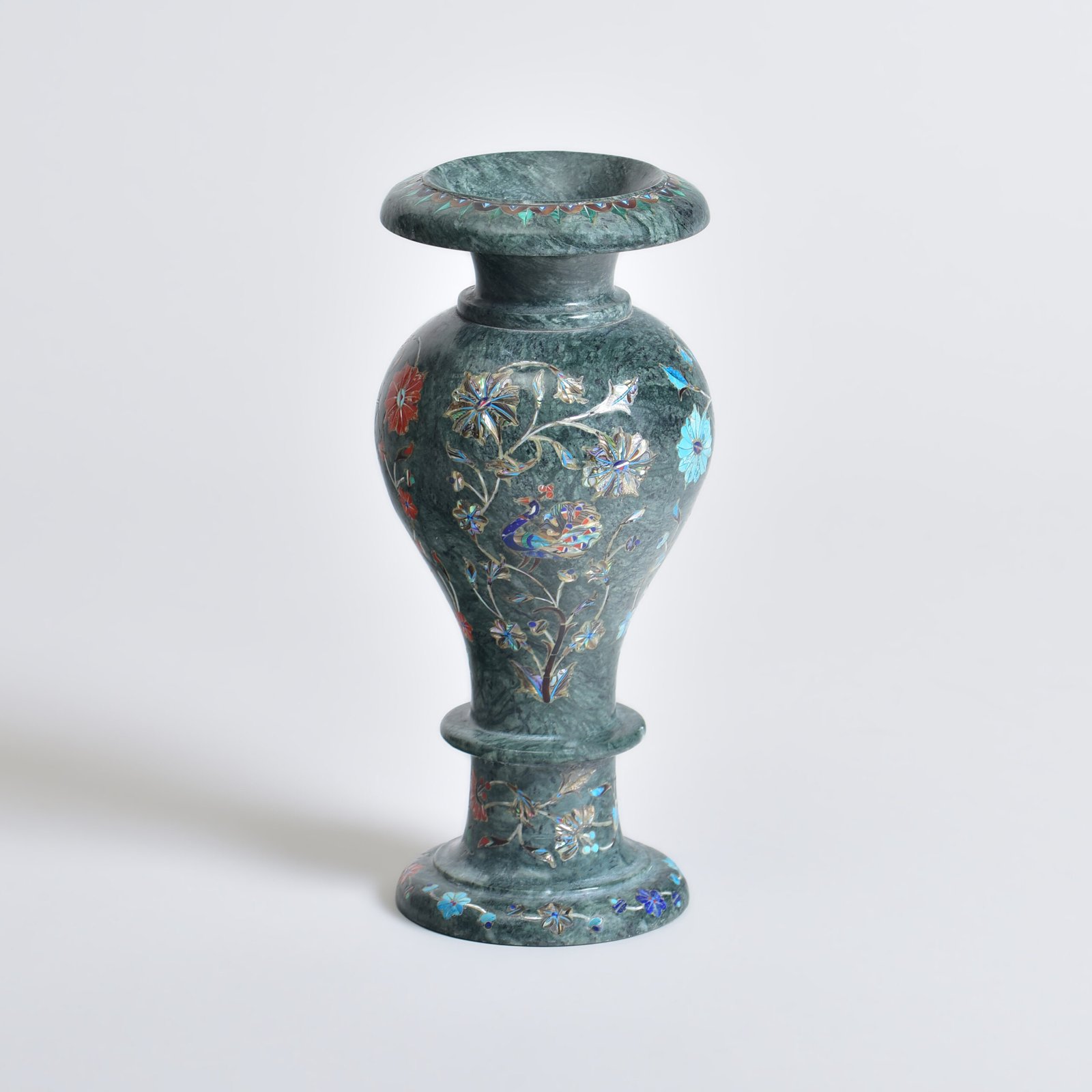 This vase tells a tale not just of beauty, but of balance, where raw earth meets fine artistry. Hewn from green marble, its natural veins speak of stone’s quiet strength. In contrast, the Parchinkari inlay, petals and vines in semi-precious stones, brings a softness, a human touch, to its solid form. It is a piece that holds tension and harmony in equal measure: nature shaped by hand, permanence softened by design.