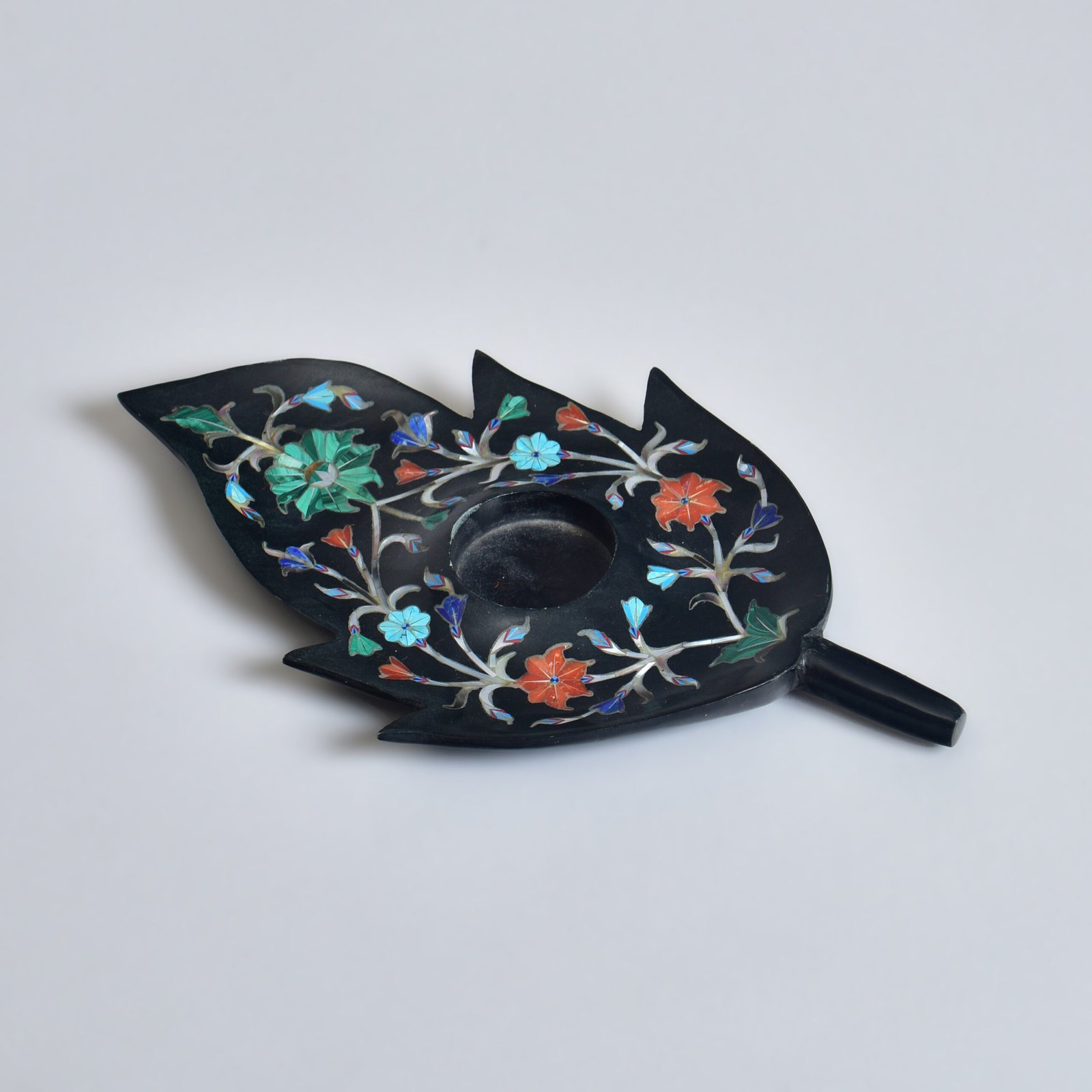 Sculpted from deep black marble, this leaf-shaped candle holder is where light meets shadow. Every curve is hand-carved, every inlay a quiet constellation, semi-precious stones set into its surface through the intricate Parchinkari technique. It evokes the stillness of a forest at dusk, the hush before a storm.
