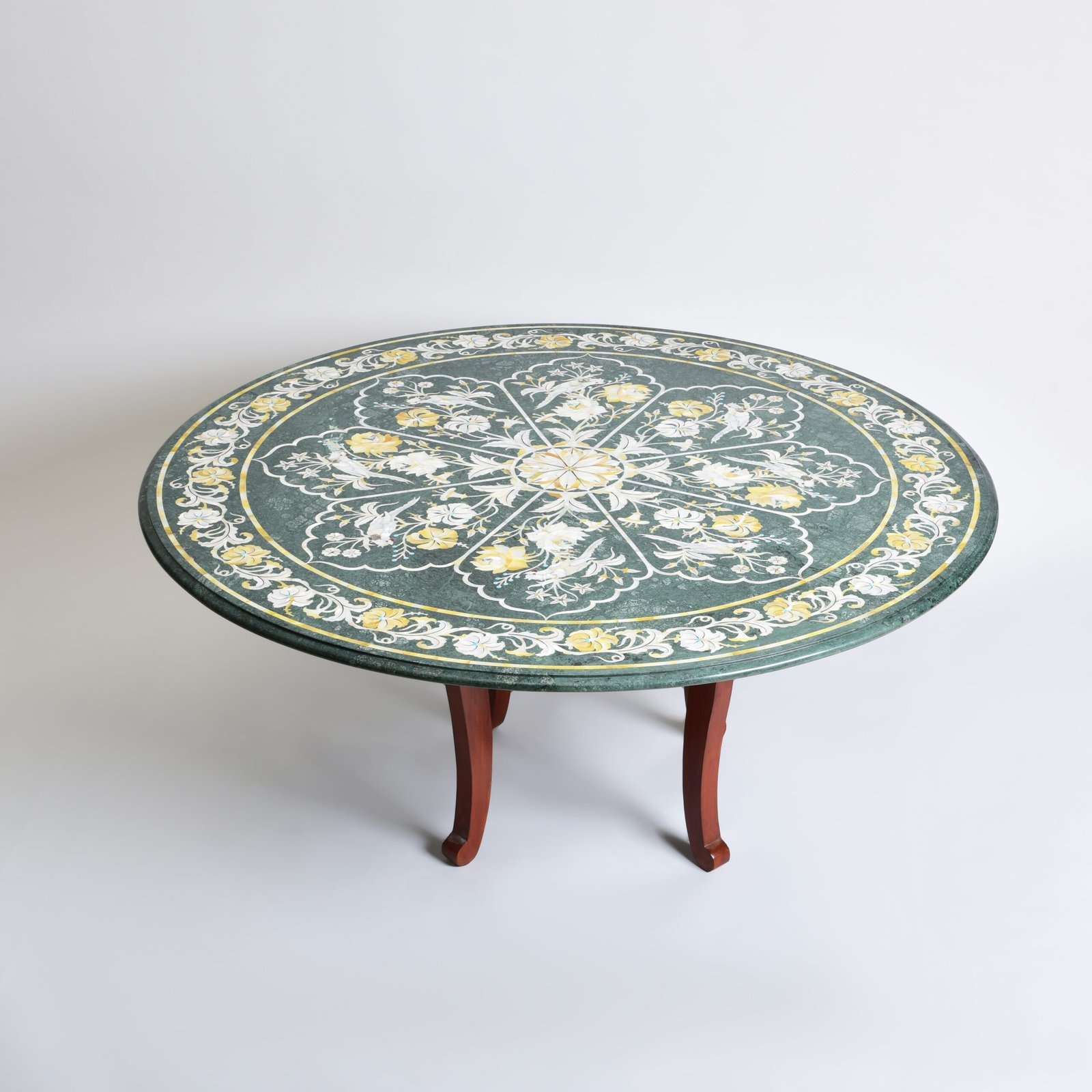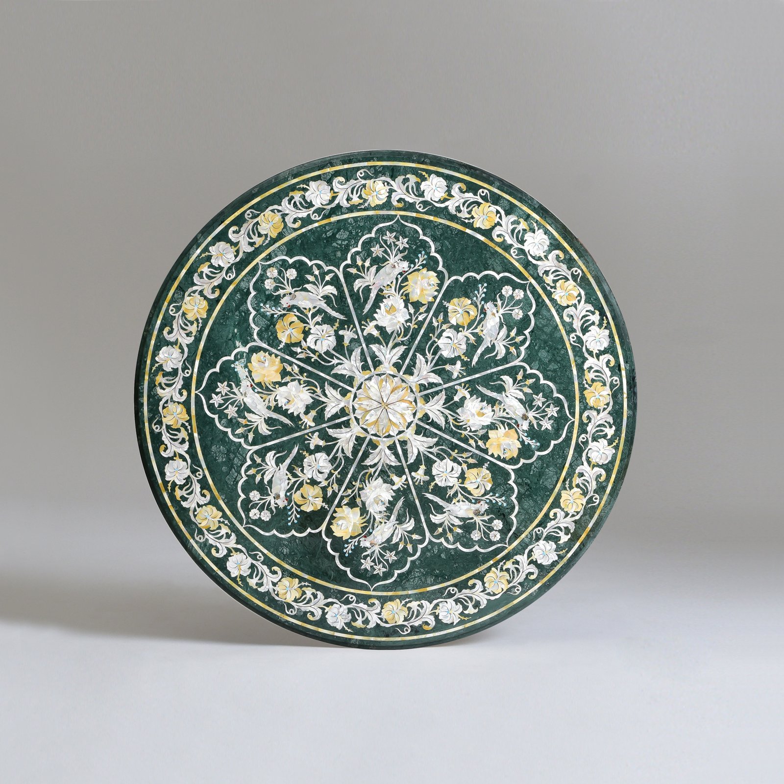 A dance of color and stone, this circular green marble table is a story set in stone. Its smooth surface is brought to life with intricate floral inlays, each petal handcraftedusing the centuries-old Parchinkari technique, and studded with semi-precious stones that shimmer like a kaleidoscope. The patterns bloom in concentric circles, creating a quiet rhythm that mesmerizes.