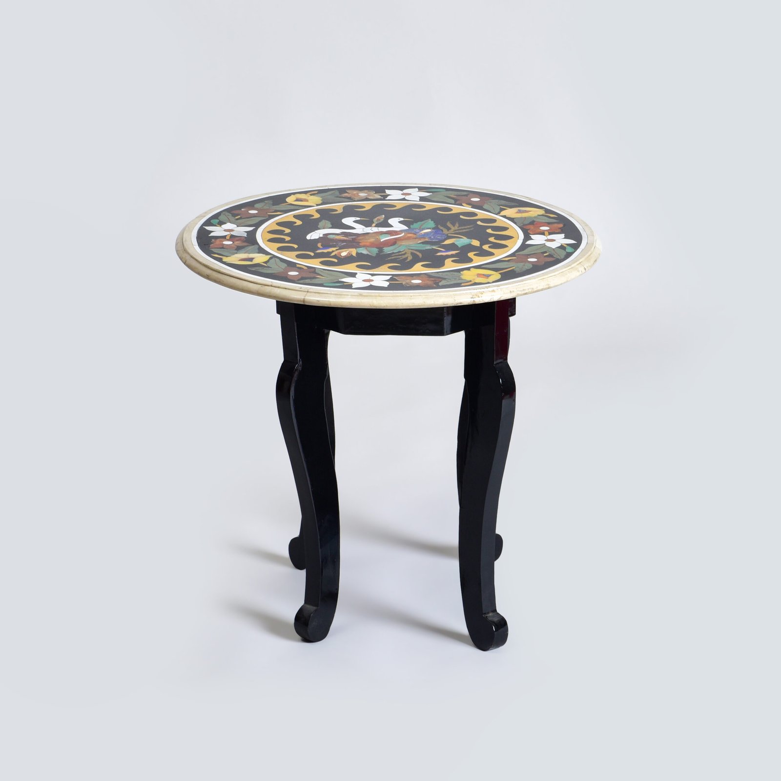 At the heart of this table lies a vision of serenity, two swans, poised in quiet elegance, gliding amidst a halo of blooms. The design is rendered with exceptional artistry, where every curve of the bird’s form and every petal that surrounds it speaks of balance, beauty, and gentle motion. Crafted with meticulous inlay, the surface feels almost like a still pond kissed by sunlight, the swan a symbol of purity and the blooms a celebration of nature’s flourish. This side table is a tranquil tableau, inviting reflection, stillness, and a touch of poetry into your space.
