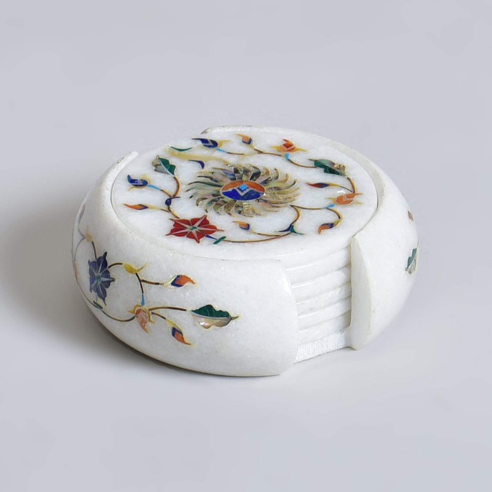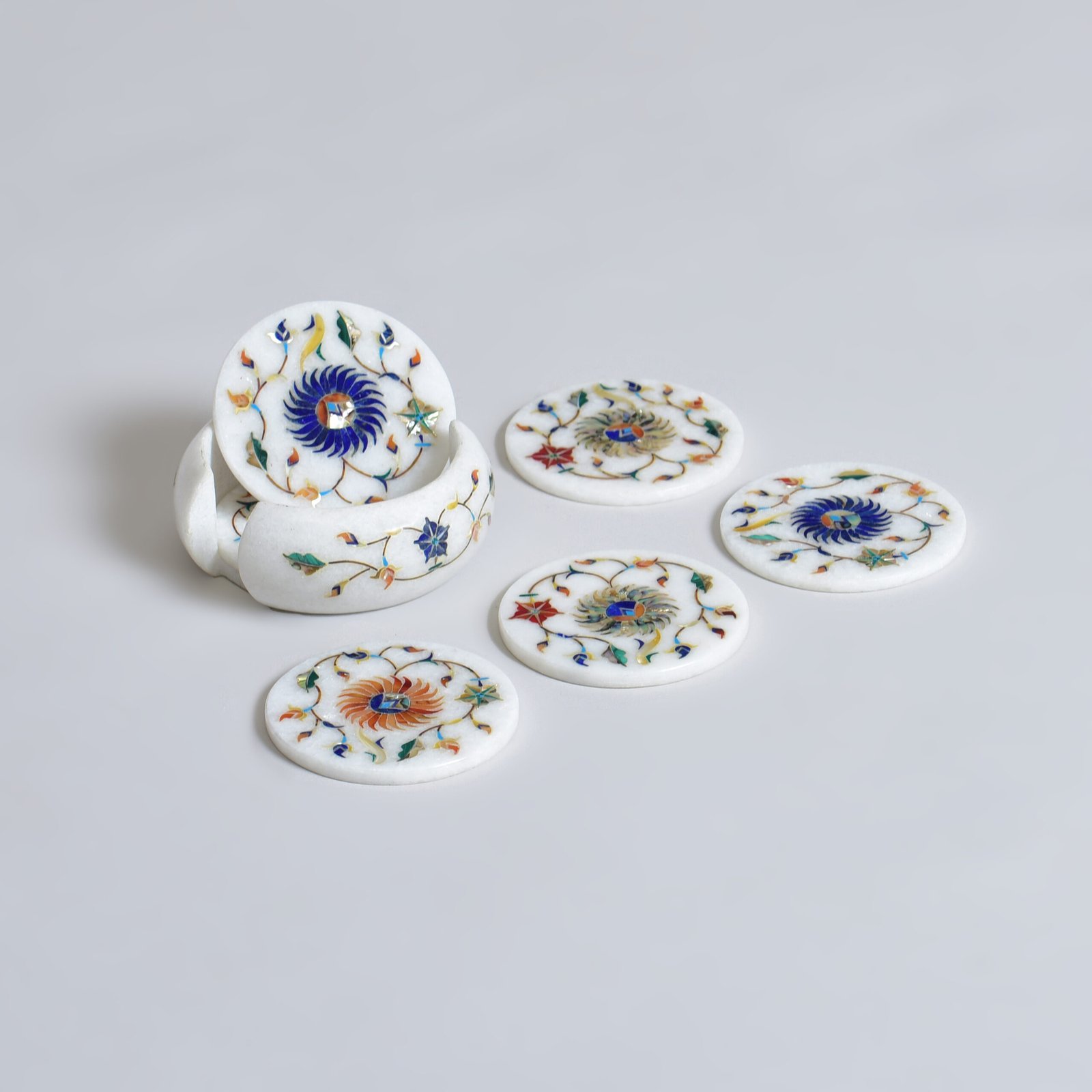 Elevate every sip with this patiently handcrafted marble coaster set, using the timeless and intricate Parchinkari technique. At the heart of each coaster blooms a delicate floral motif, encircled by graceful leaf vines, all meticulously inlaid with shimmering semi-precious stones that catch the light with quiet brilliance.