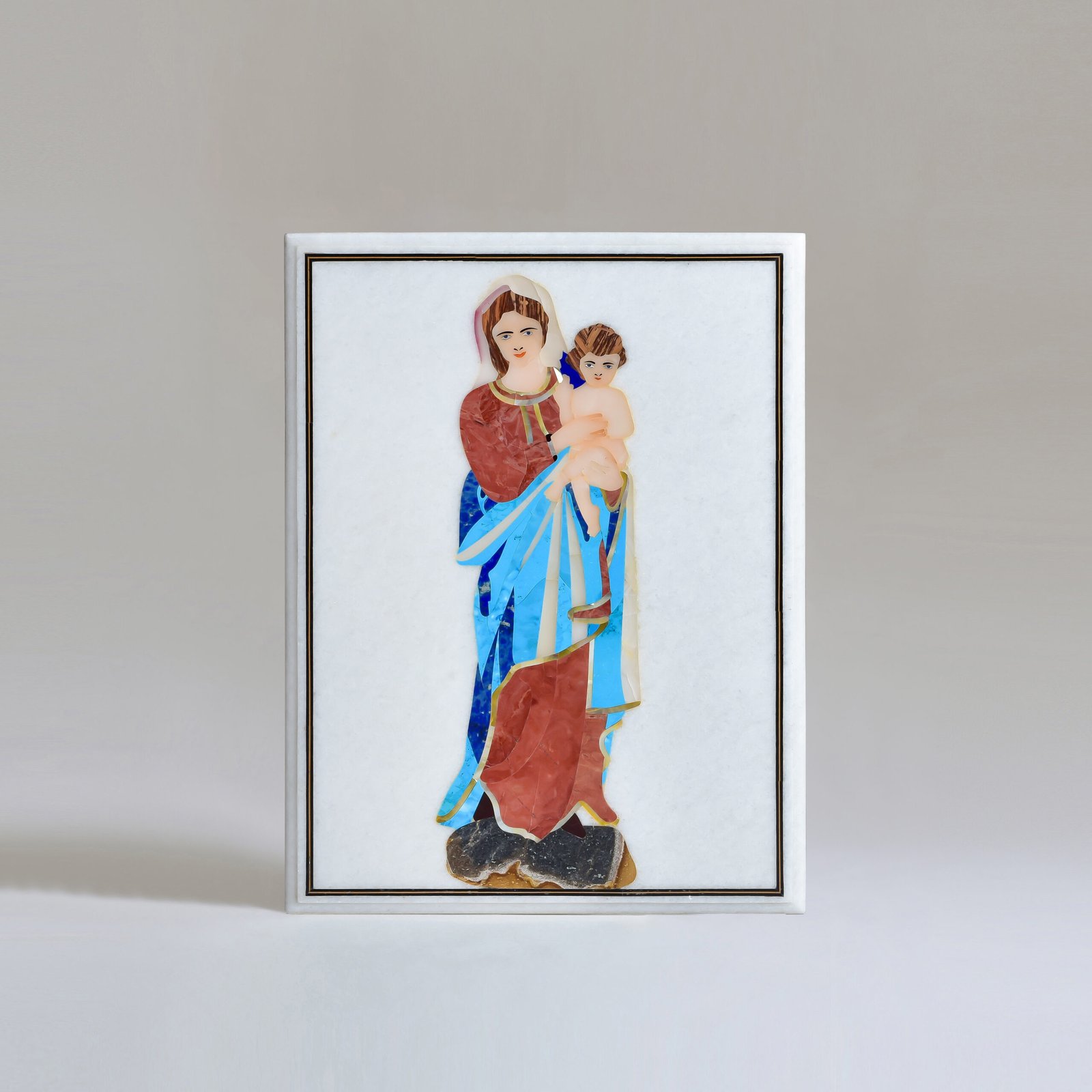 Tender and timeless, this marble wall art portrays the Virgin Mary cradling the infant Jesus, a moment of divine love captured with reverence and grace. The figures are rendered with gentle contours and serene expressions, radiating warmth, protection, and a deep spiritual stillness. Subtleness of the art reflects traditional craftsmanship, while the marble backdrop adds a sense of purity and permanence. Ideal for prayer corners or peaceful interiors, this piece invites reflection and fills the home with a quiet, sacred presence.