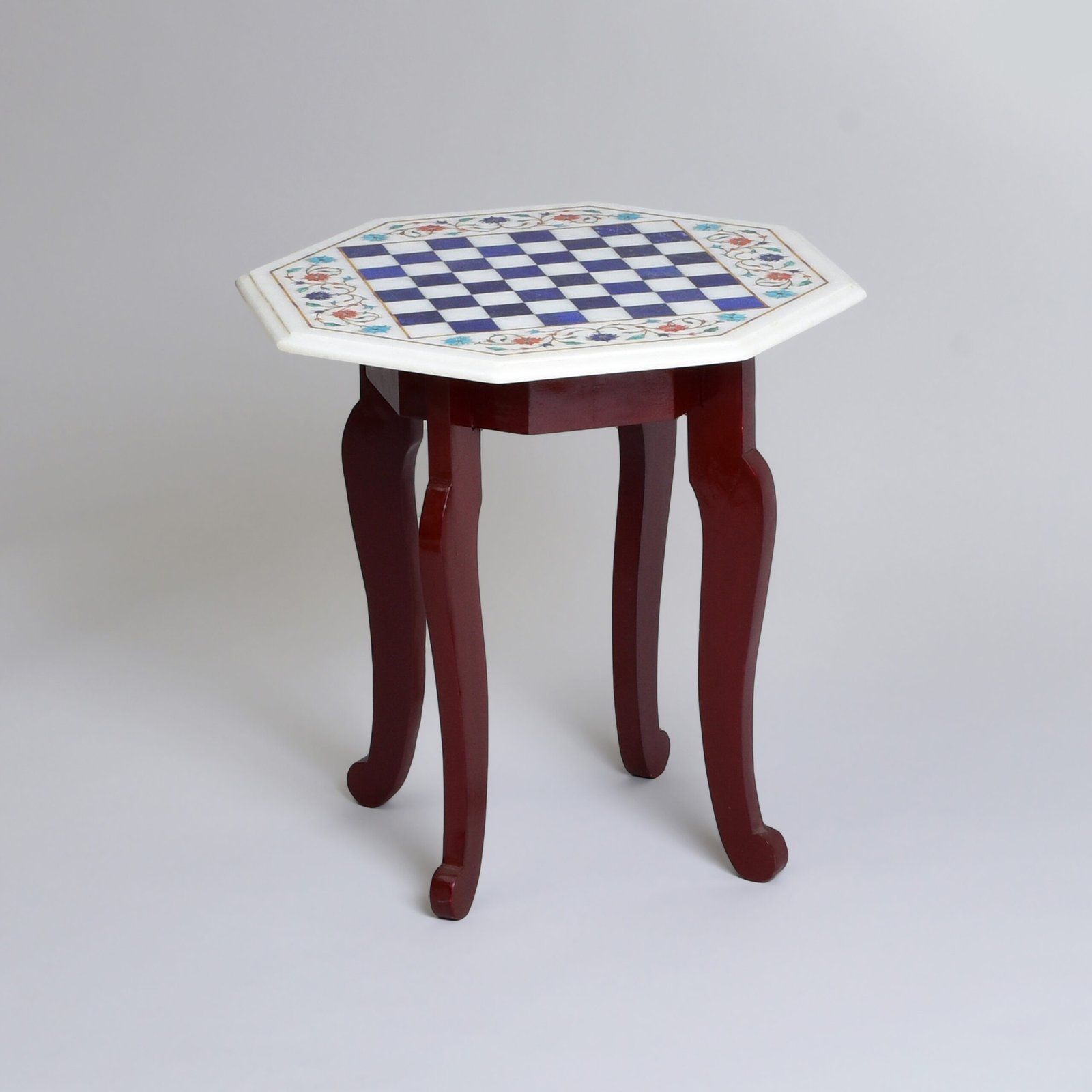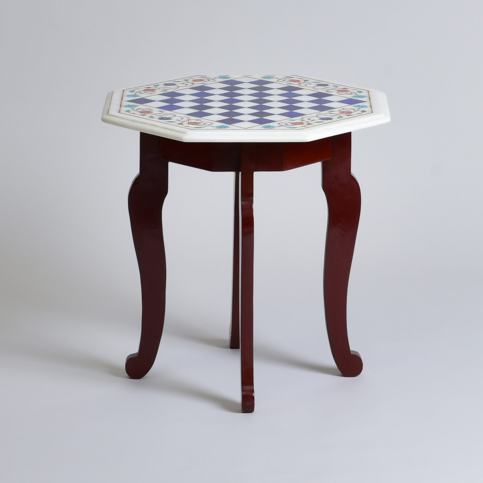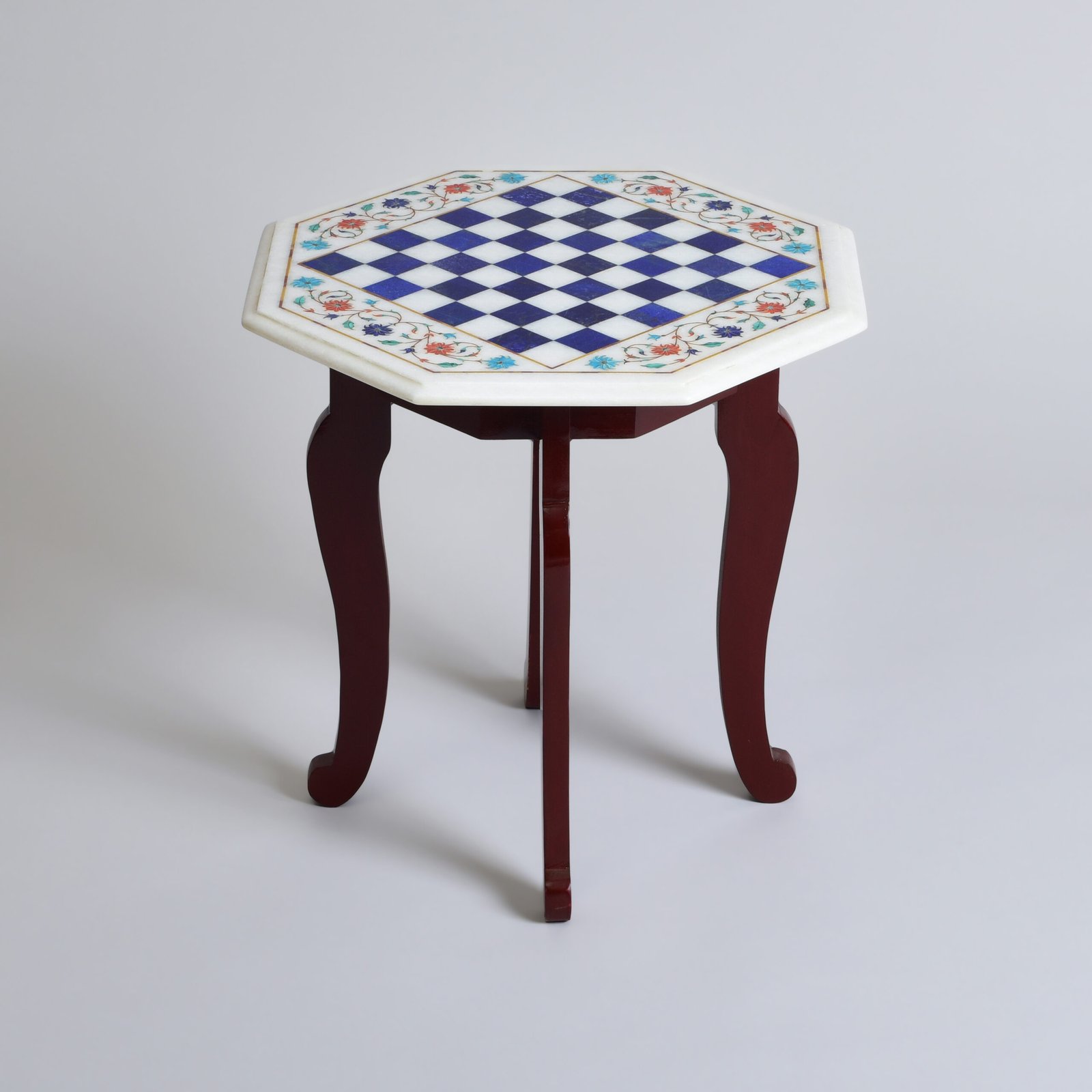 Crafted with exquisite artistry, this octagonal Chess Table transforms every game into a timeless ritual. The striking blue and white chessboard invites deep focus, while the surrounding floral motifs, created with the delicate Parchinkari technique and adorned with shimmering semi-precious stones, evoke a sense of heritage and elegance. Each detail tells a story of tradition meeting thoughtful design, making it more than just a table.