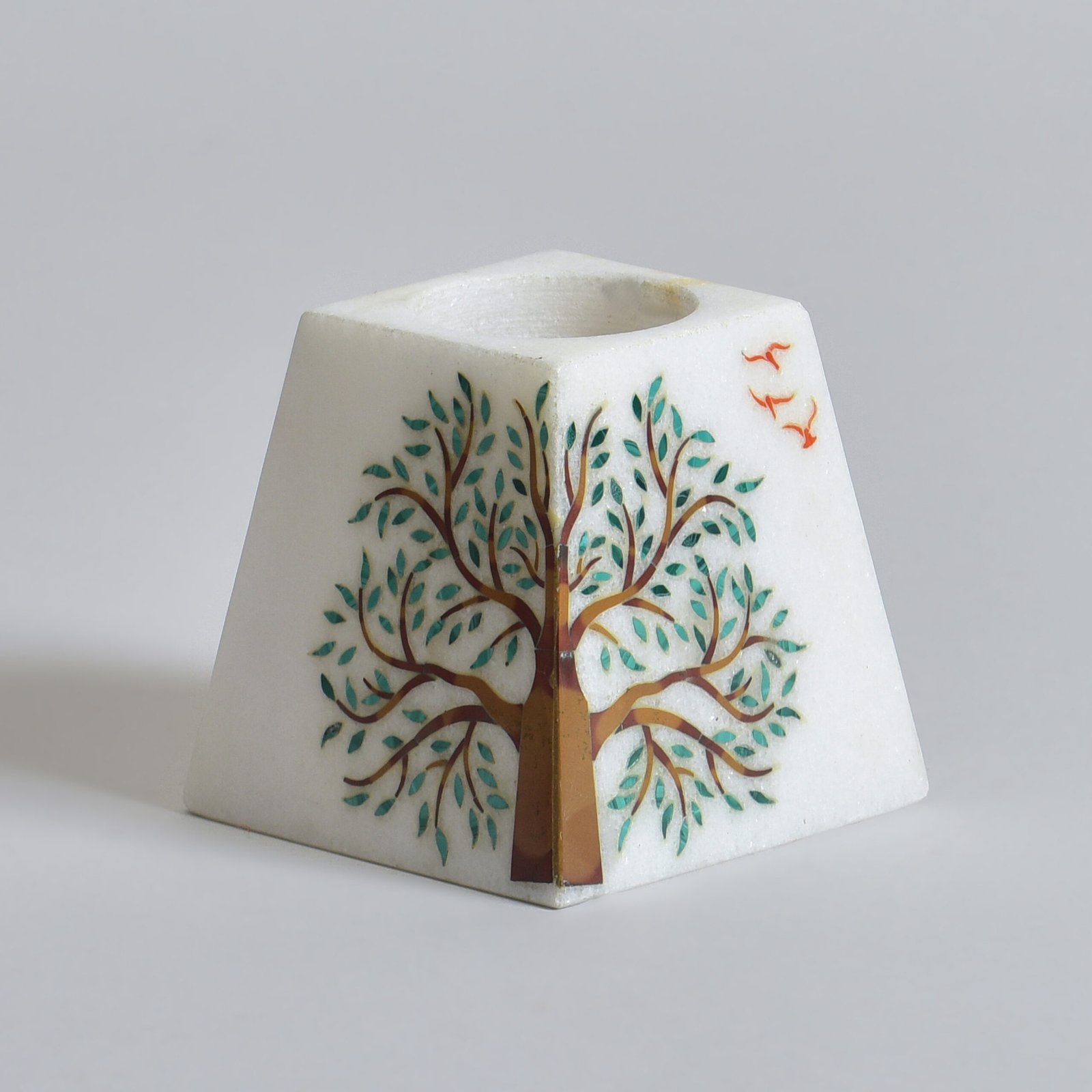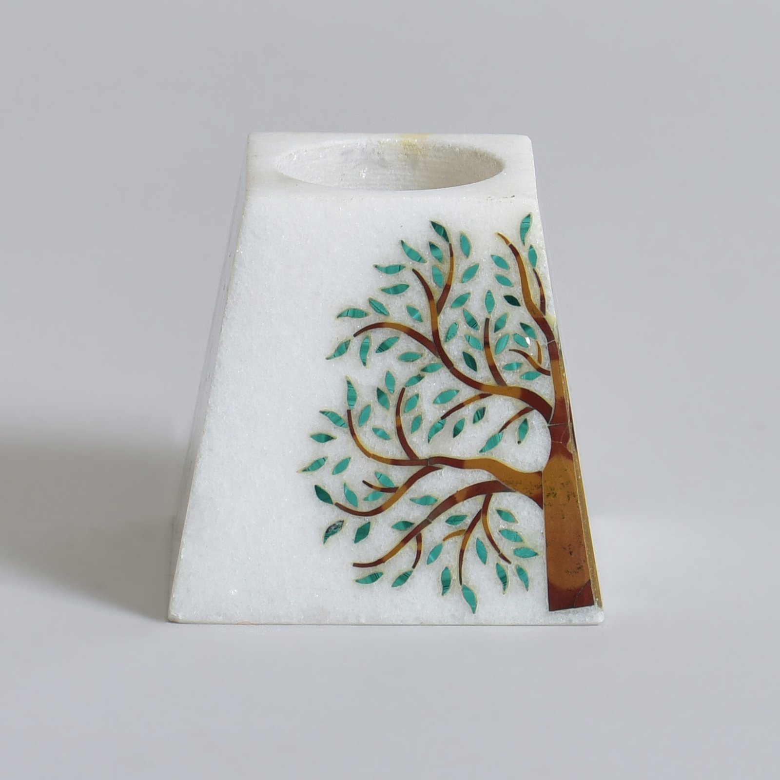 Carved from pristine white marble, this Brush Holder tells a quiet story of craftsmanship and heritage. Its surface blossoms with a delicate branching tree, brought to life through the ancient Parchinkari technique, each leaf and bloom inlaid with semi-precious stones that catch the light like dew at dawn. This is not merely a vessel, but a piece of poetry rendered in stone.