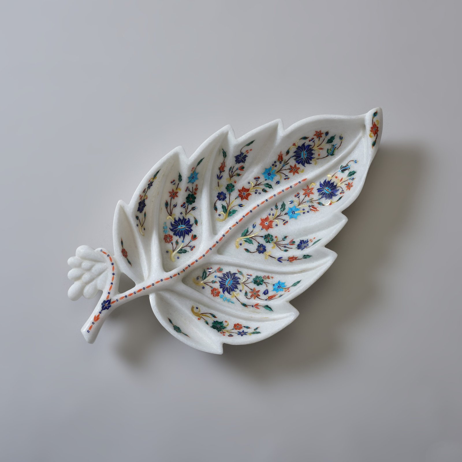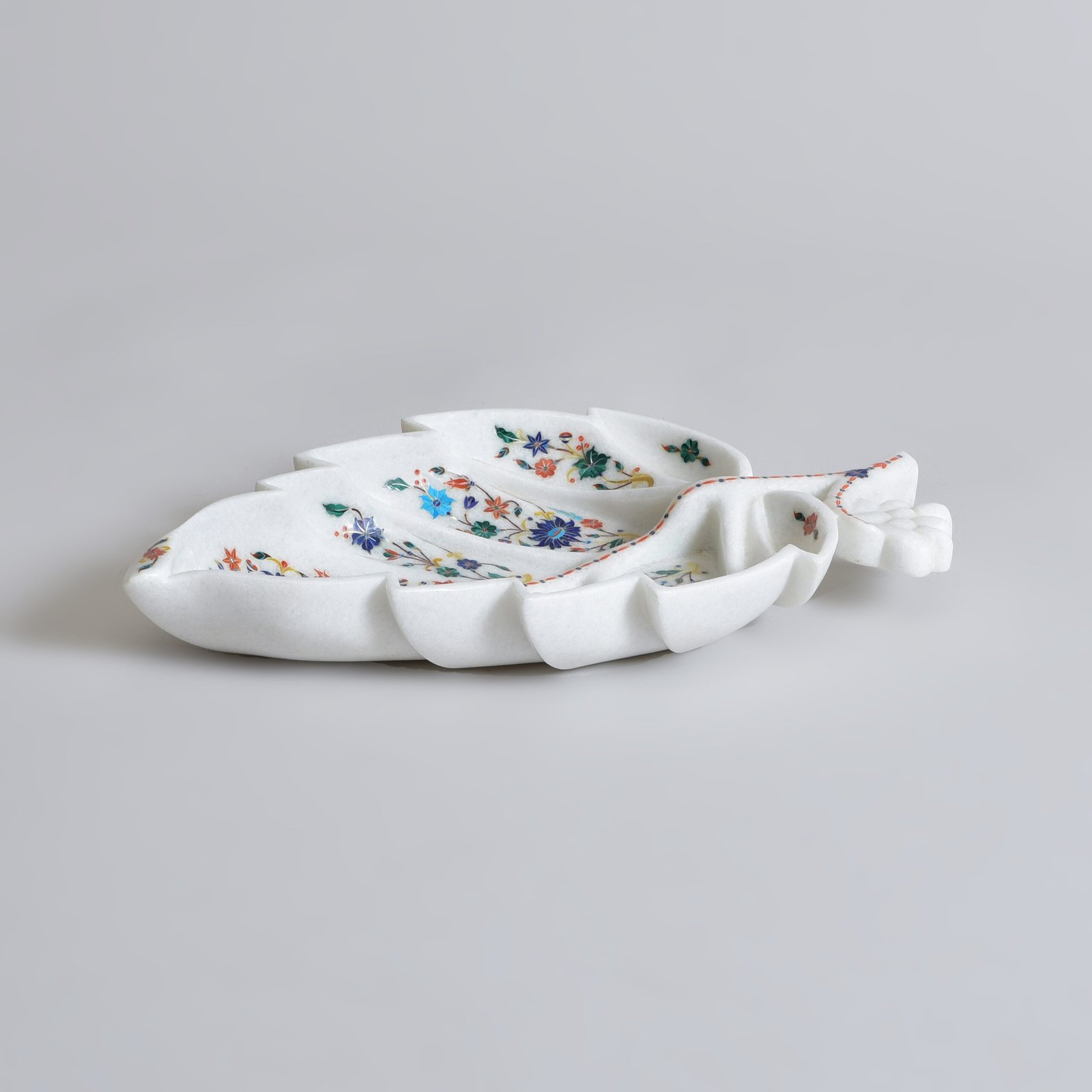 Delicately carved from luminous white marble, this leaf-shaped tray is a quiet ode to nature’s elegance. Along the gentle veins of the leaf, intricate floral motifs bloom, brought to life with the ancient Parchinkari inlay technique, using semi-precious stones that glimmer softly in the light. This piece carries the meditative pace of a craft perfected over generations, balanced by a minimalist form that speaks to contemporary sensibilities.