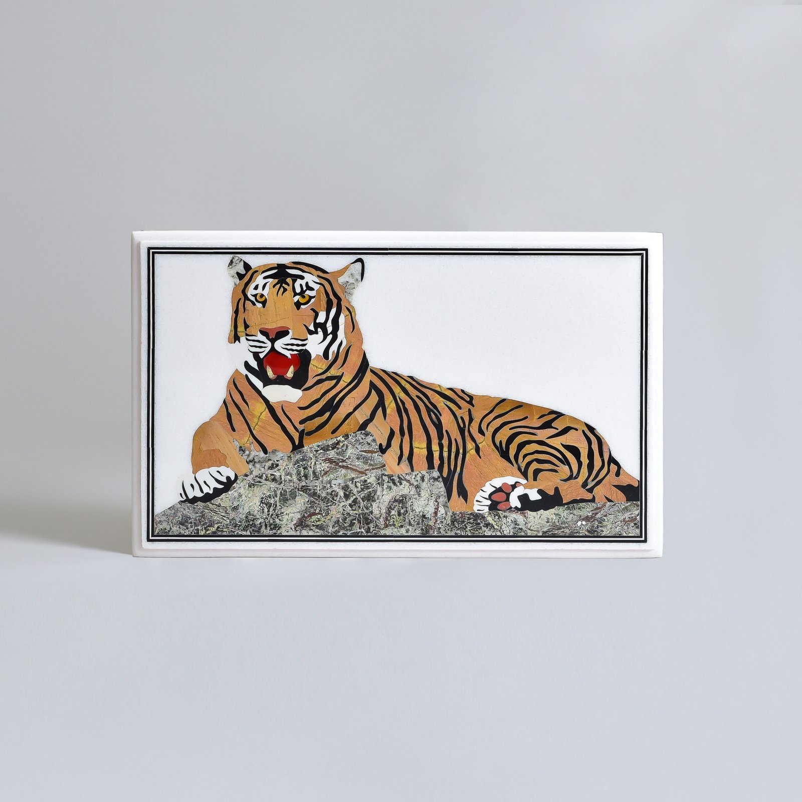 Unleash the raw spirit of the wild into your home with this striking Marble Wall Art, where strength meets serenity. Handcrafted using the ancient Parchinkari technique, this rectangular white marble canvas features a majestic tiger mid-roar, perched powerfully upon a rock. Intricately inlaid with semi-precious stones, each detail, from the gleam in its eye to the tension in its muscles, radiates life and grandeur.