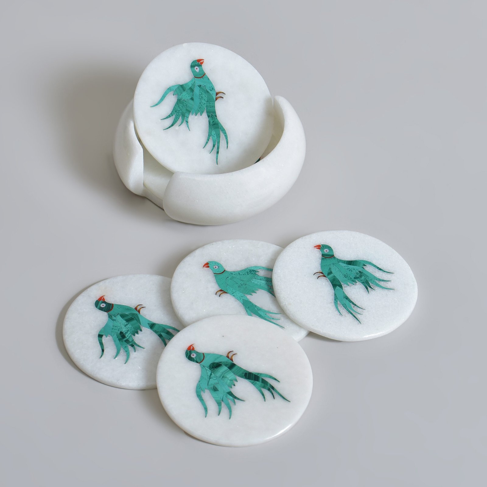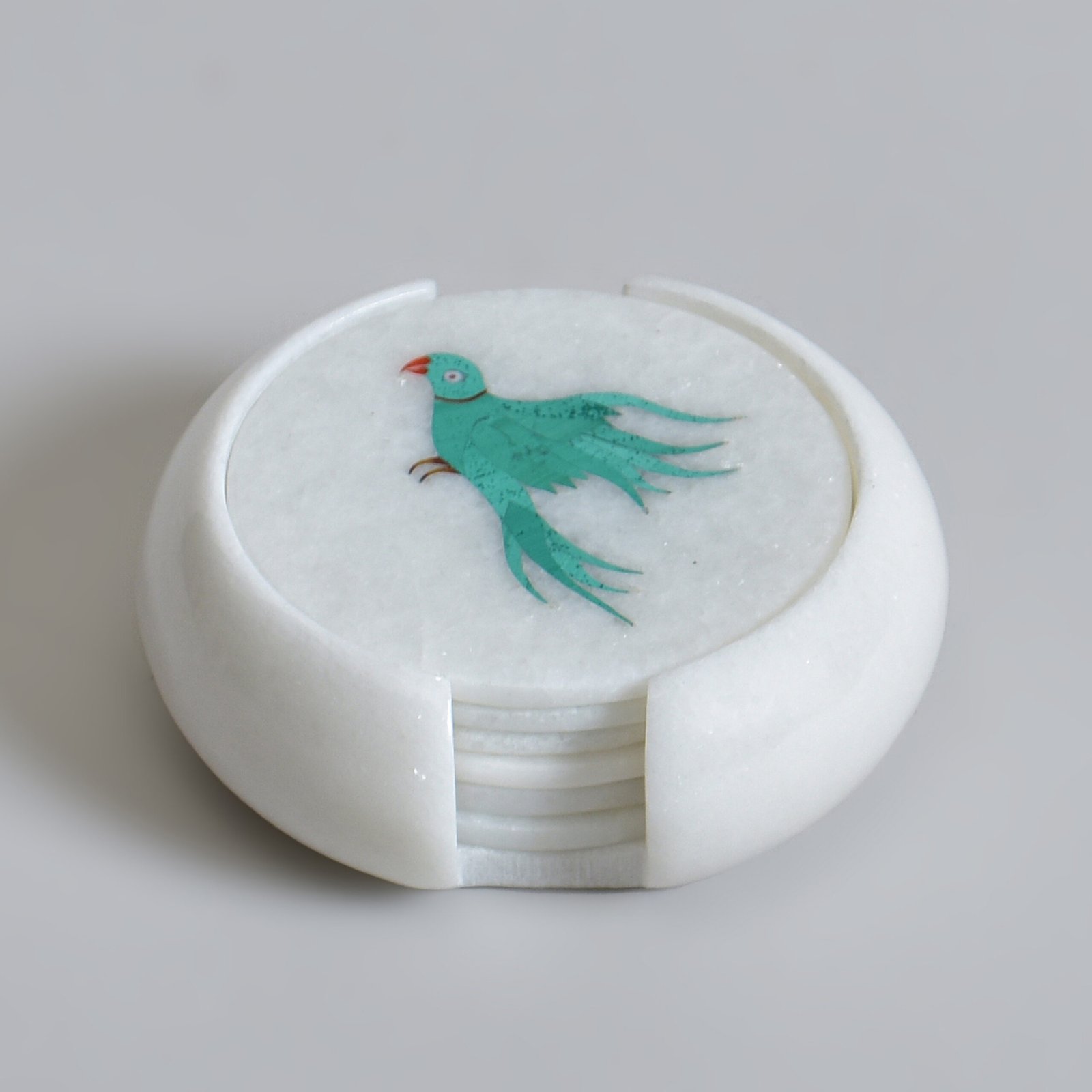 Let your table tell a story of timeless elegance with this handcrafted marble coaster set, adorned using the ancient Parchinkari technique. Semi-precious stones come alive in the form of a turquoise parrot mid-flight, each feather a whisper of royal artisanship, each stroke echoing a legacy of beauty.