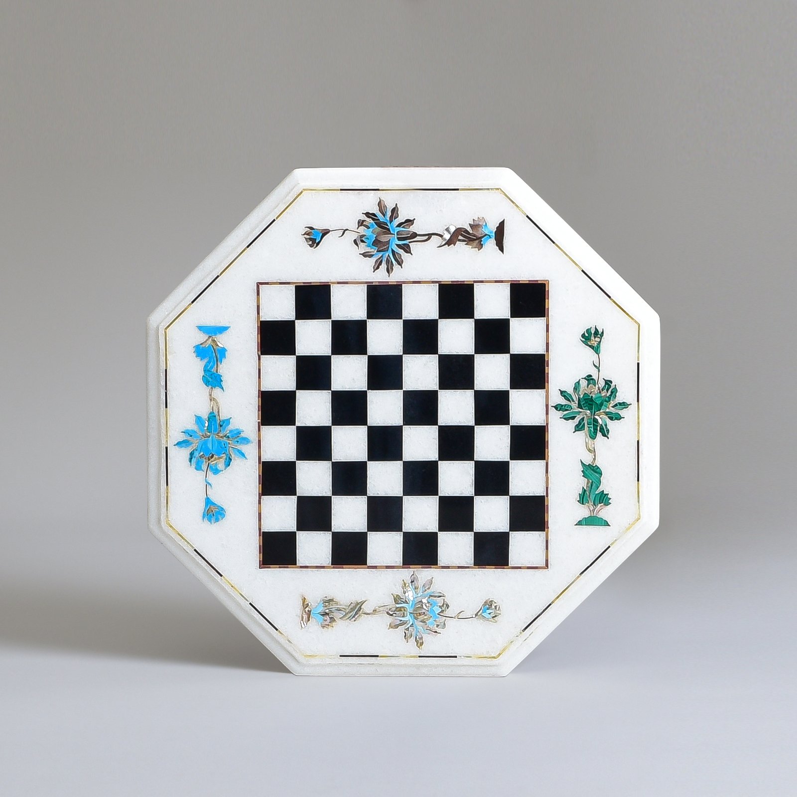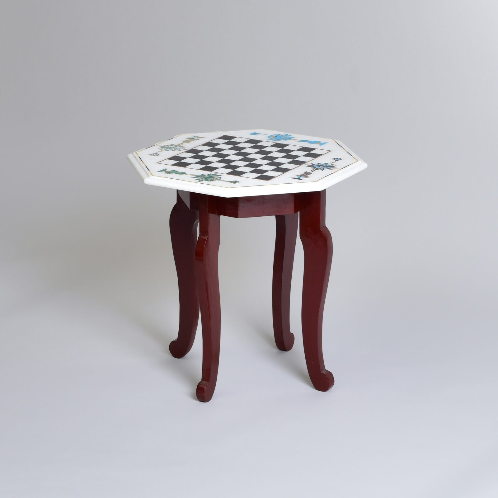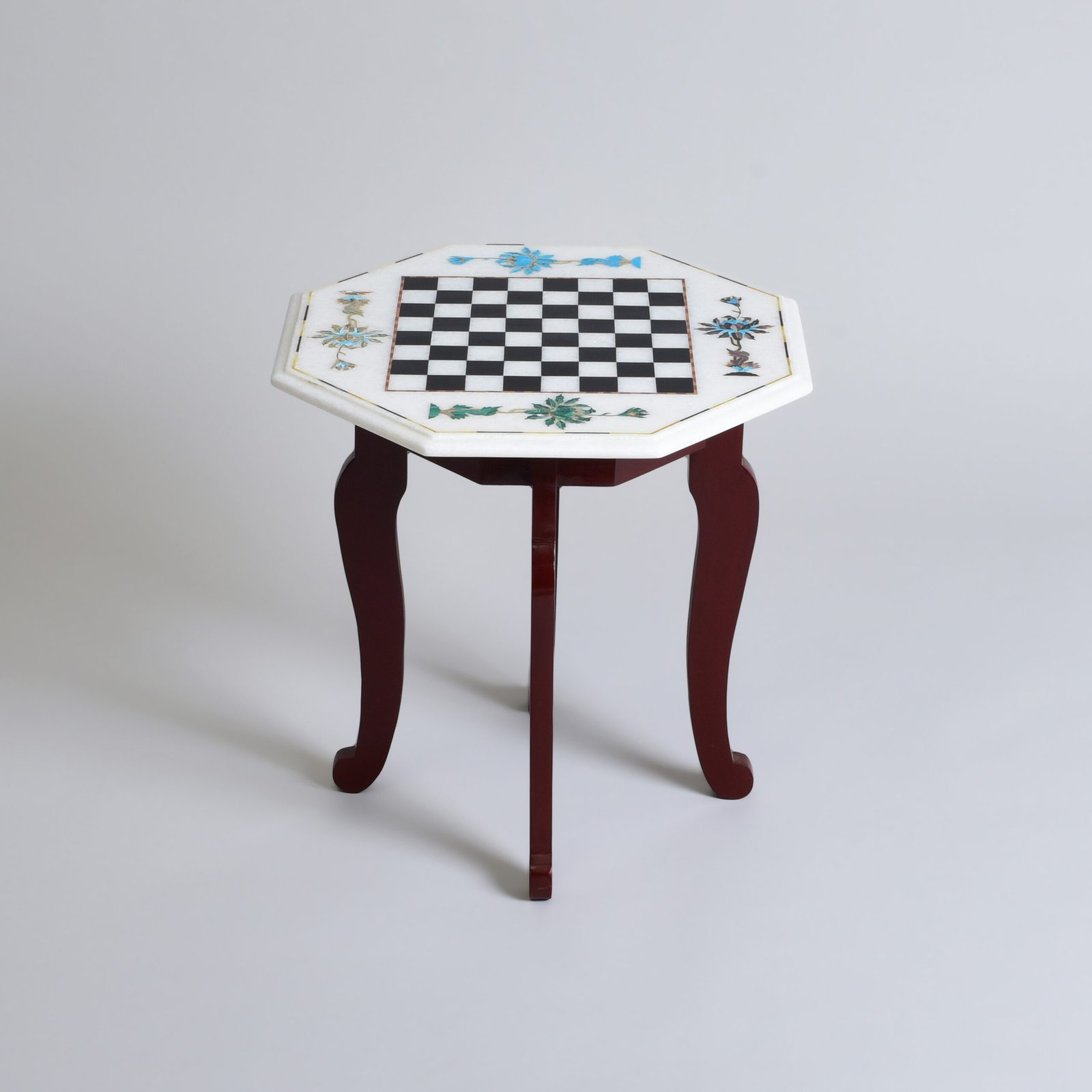 Step into a timeless duel of minds with this octagonal chess table, where tradition and artistry converge in perfect harmony. At its centre lies the iconic black and white battlefield, a stage for strategy and intellect, framed by intricate floral motifs crafted using the ancient Parchinkari technique.