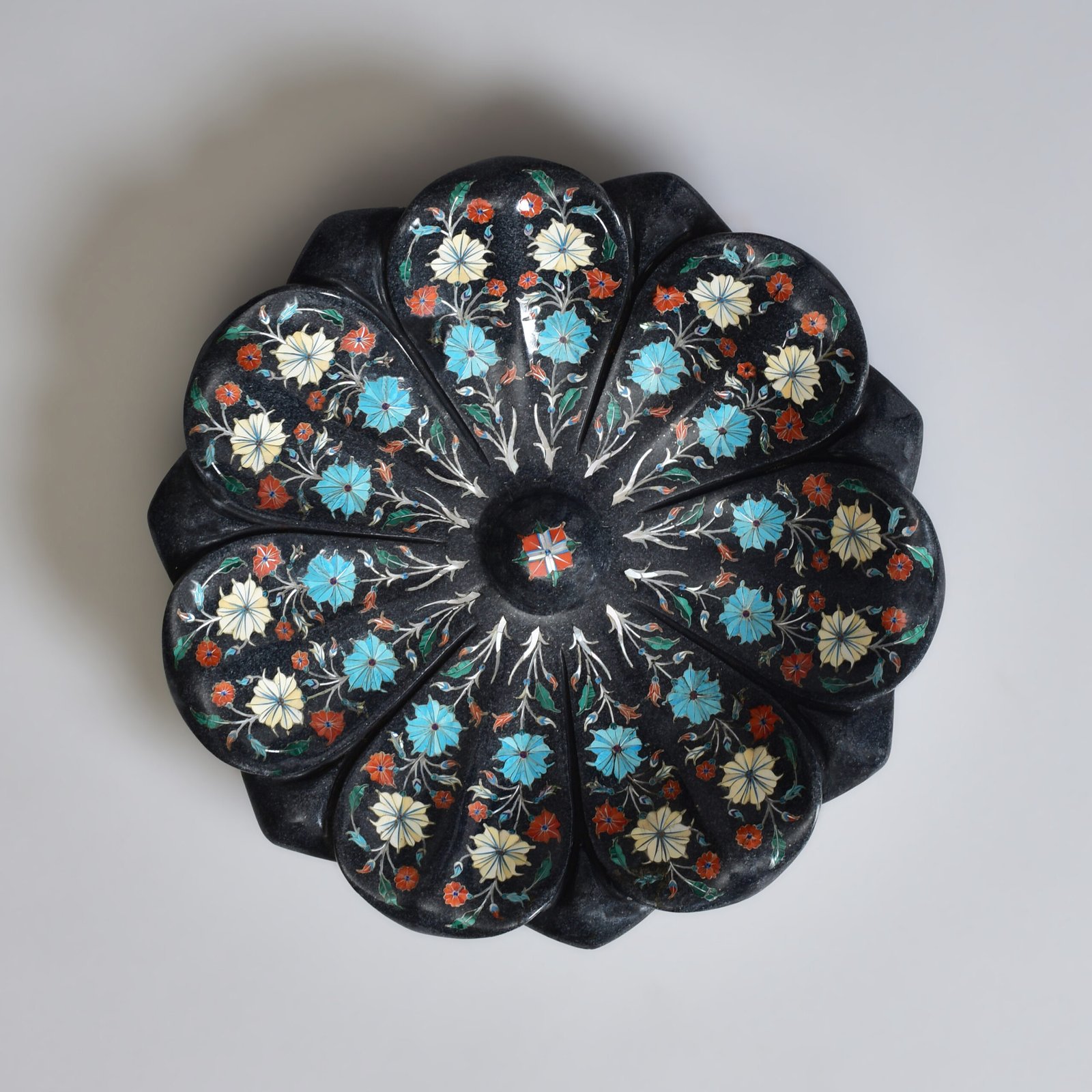 A moonlit garden carved in stone. This black marble bowl, inlaid with delicate floral motifs using the centuries-old Parchinkari technique, is both mysterious and refined. The dark surface creates a dramatic contrast against the glimmer of semi-precious stones, each petal catching the light like stars on a new moon night.