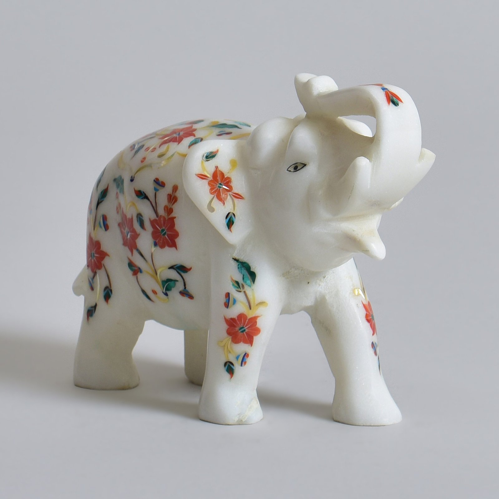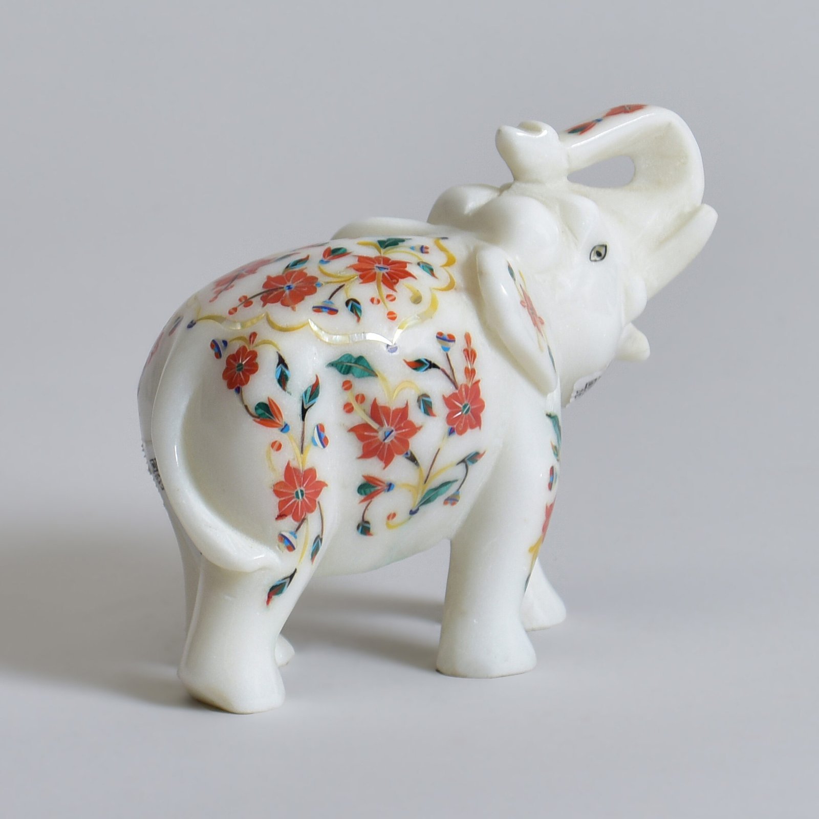 This marble elephant echoes the grandeur of India’s rich artistic heritage, symbolising wisdom, strength, and good fortune. Meticulously handcrafted in the Parchinkari tradition, its surface blossoms with delicate floral patterns inlaid with radiant semi-precious stones.