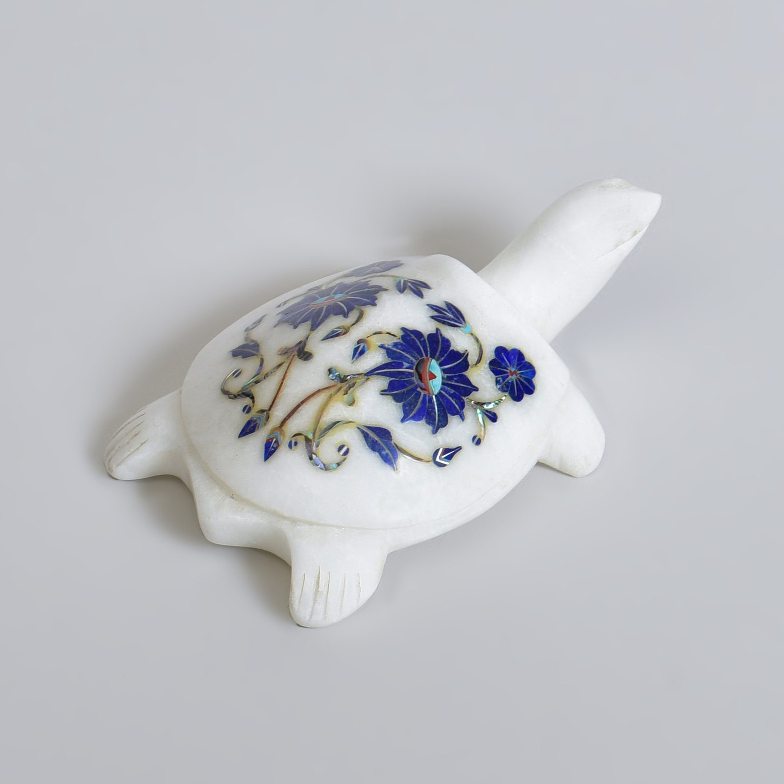 Embodying wisdom and enduring grace, this exquisite turtle sculpture is meticulously hand-carved from pure white marble and embellished with a stunning design of semi-precious stones sourced worldwide. Each gem is carefully set using the ancient Parchinkari technique, crafting a timeless work of art that captivates the eye.