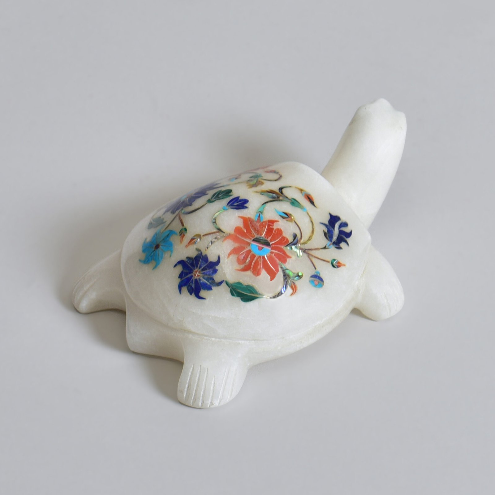 A symbol of wisdom and longevity, this elegant turtle is hand-carved from pristine white marble and adorned with semi-precious stones curated from across the globe. Each stone is inlaid using the centuries-old Parchinkari technique, bringing to life a timeless piece of art.