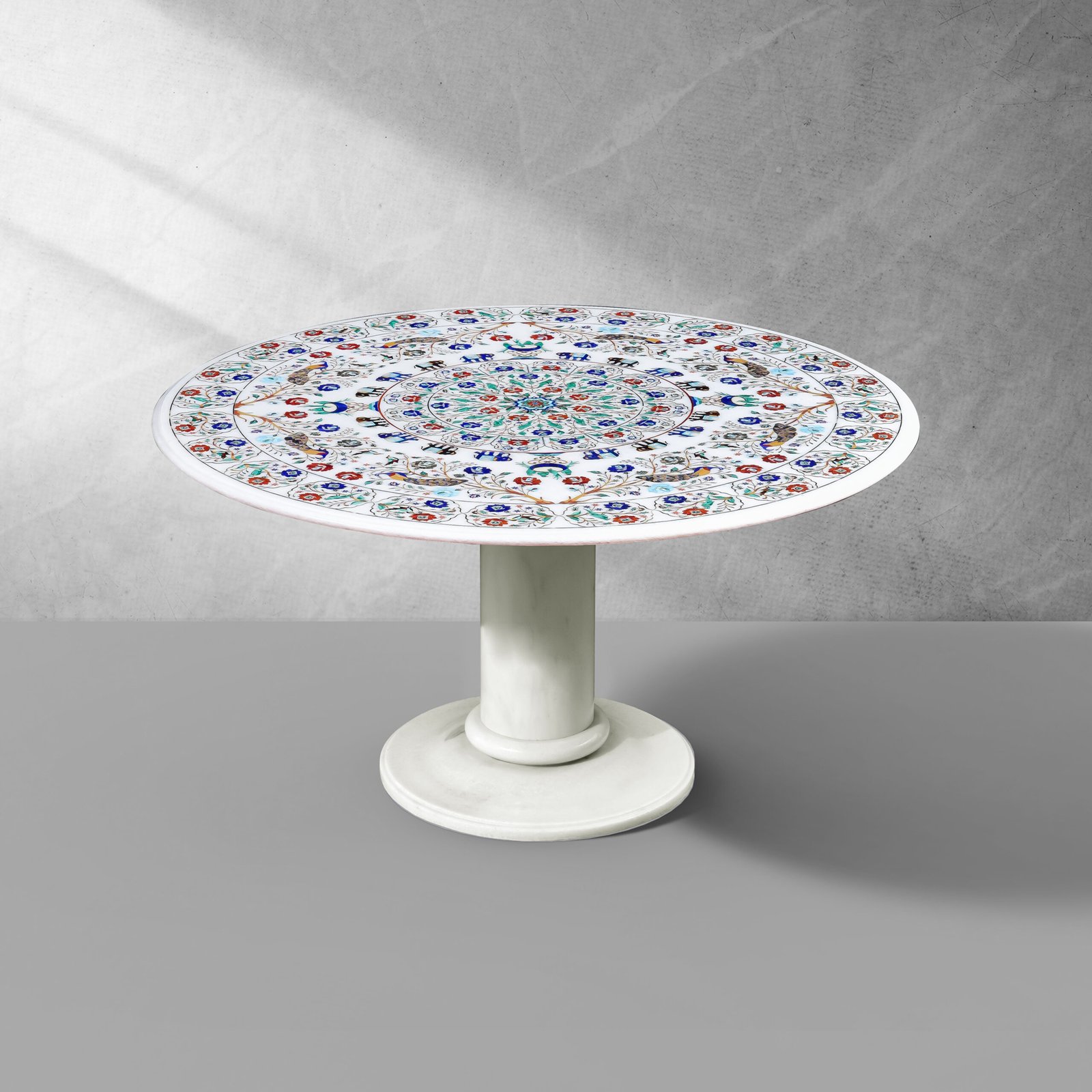 Give your dining room a transformation inspired by India’s rich heritage. A masterpiece in marble, this circular dining table transforms meals into an elegant dining experience. Handcrafted from pristine Vietnam-sourced white marble, it is adorned with semi-precious stones sourced from across the globe, each inlaid with the ancient Parchinkari technique to form a breathtaking floral symphony.