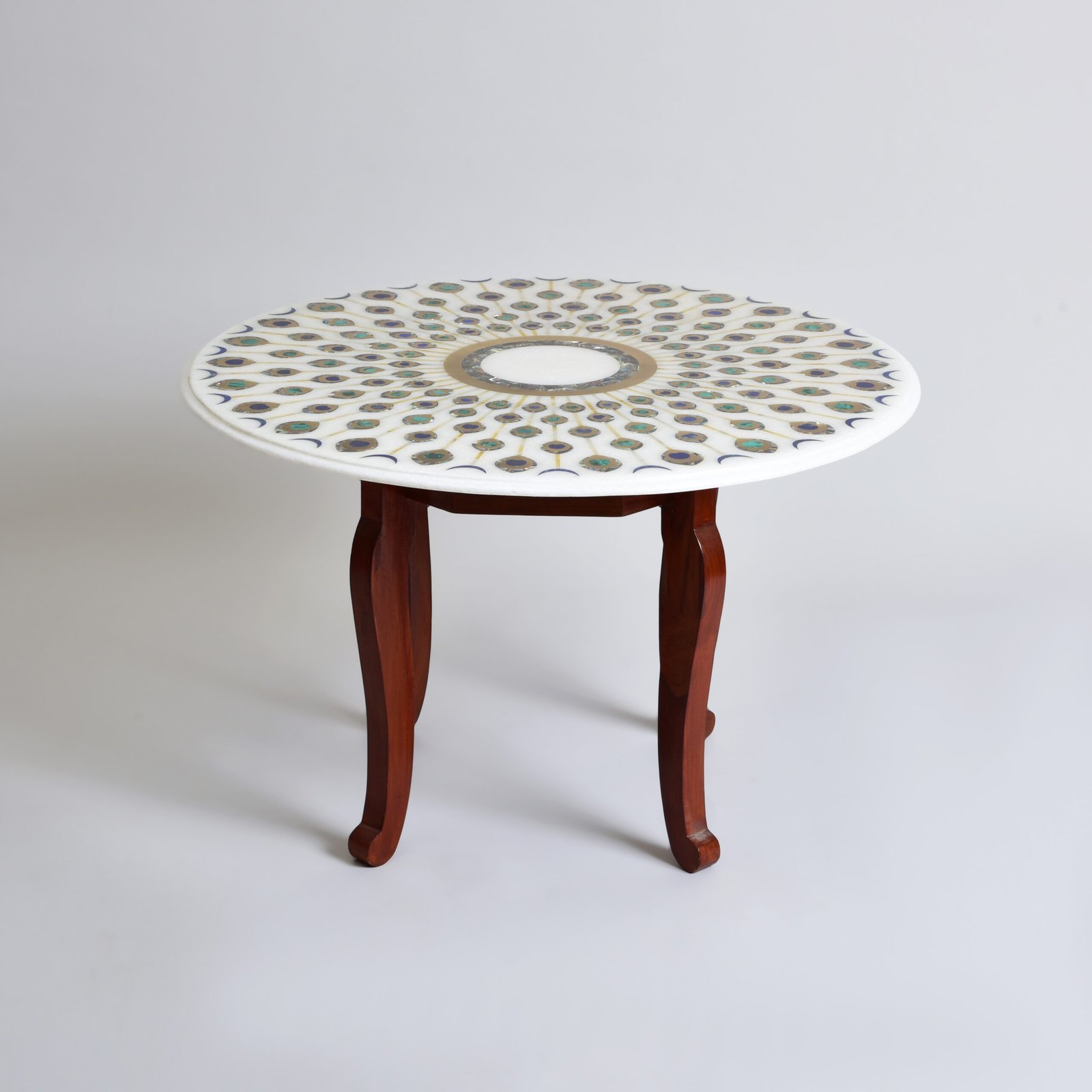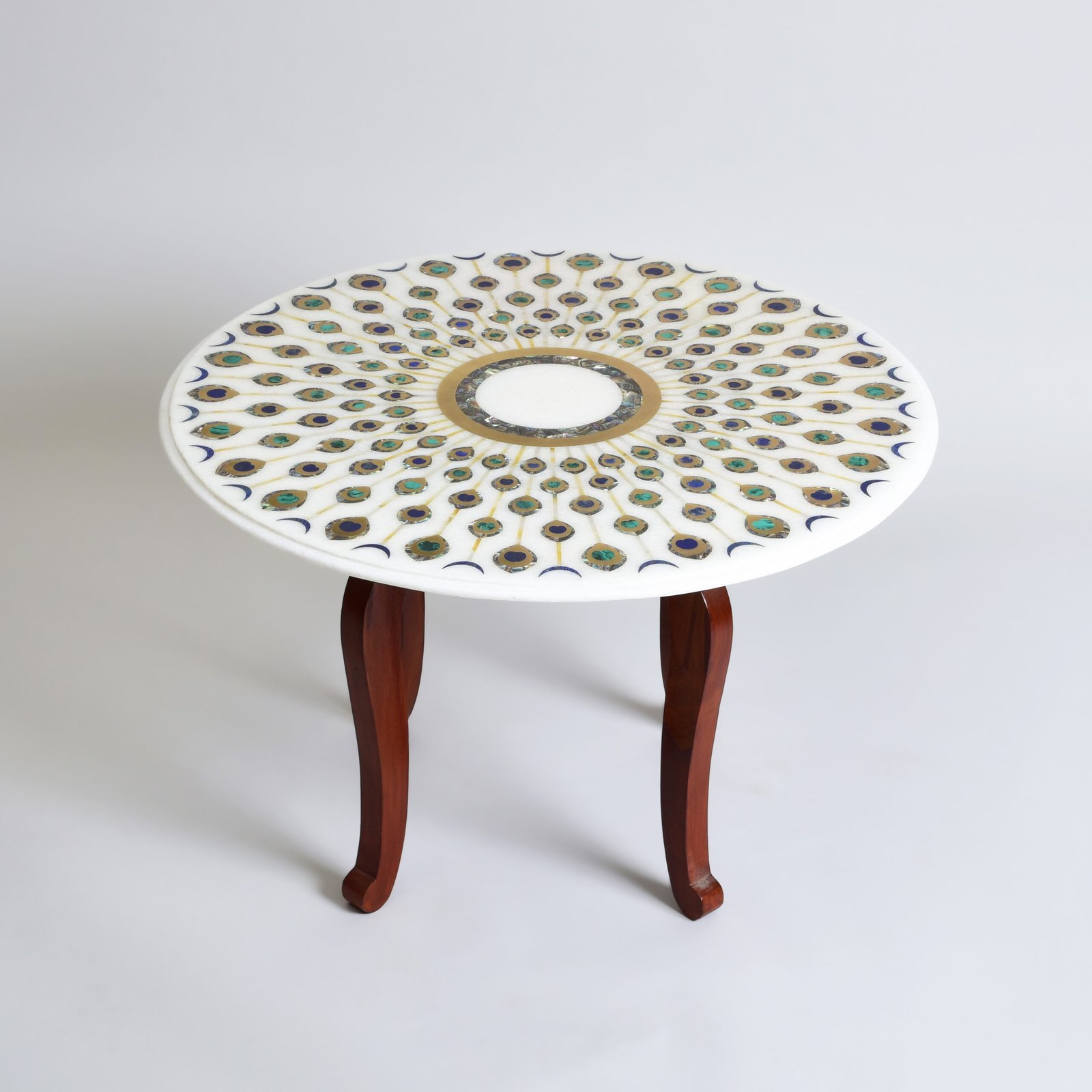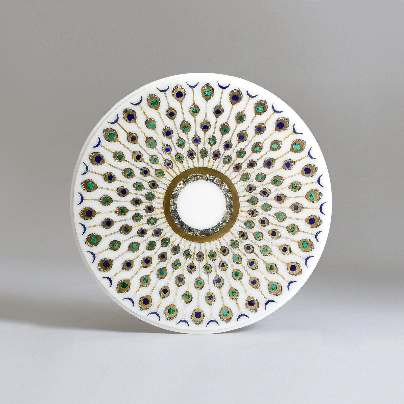 A celebration of symmetry and storytelling, this circular white marble table is a work of still poetry. At its heart, a delicate inlaid ring unfurls into radiant lines, each blooming with a peacock feather, meticulously crafted using the Parchinkari technique with semi-precious stones. The design dances between geometry and grace, evoking a kaleidoscope caught in time.