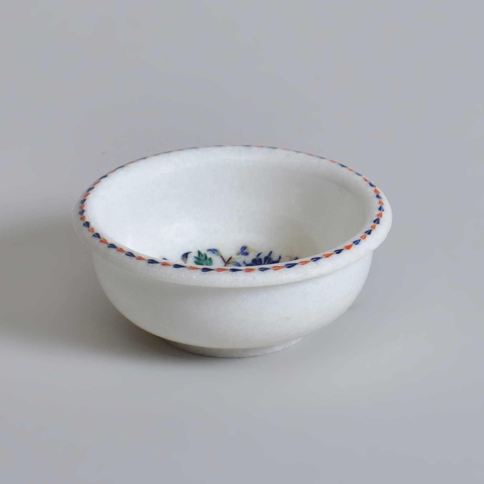 There’s something luminous about this piece. The white marble reflects light like soft silk, while its inlaid floral patterns catch glimmers of colour in unexpected ways. Crafted using the intricate Parchinkari technique, each motif is brought to life with semi-precious stones, cool to the touch, warm to the eye.