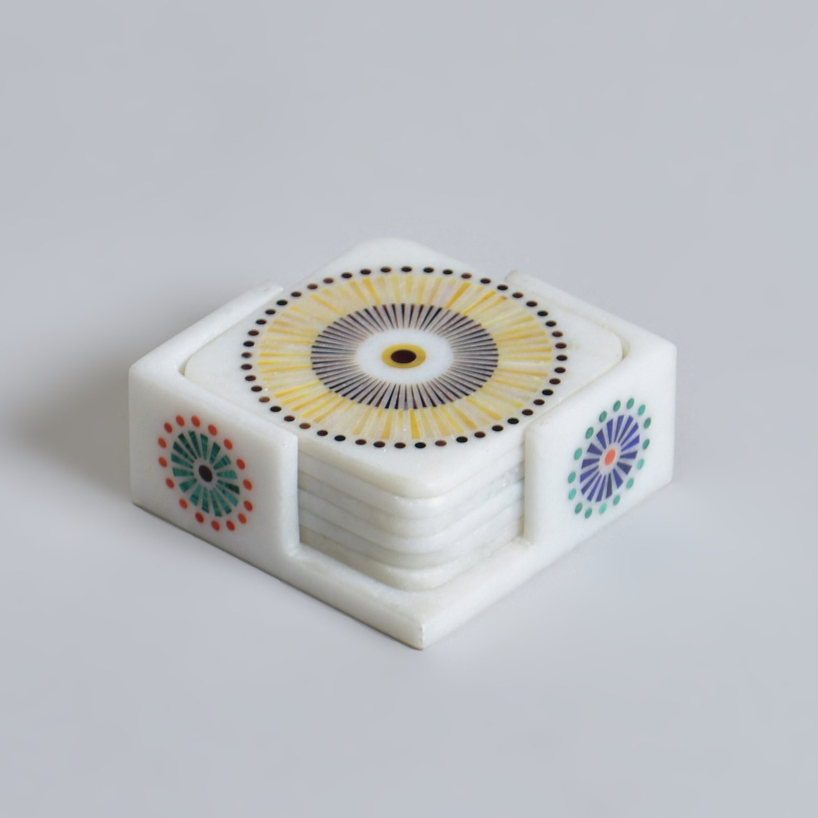 Elevate your space with this exquisite marble coaster set, handcrafted using the ancient and intricate Parchinkari technique. Each coaster is adorned with vibrant semi-precious stones, arranged in colourful strips that spiral gracefully, evoking the meditative rhythm of a mandala’s dance.