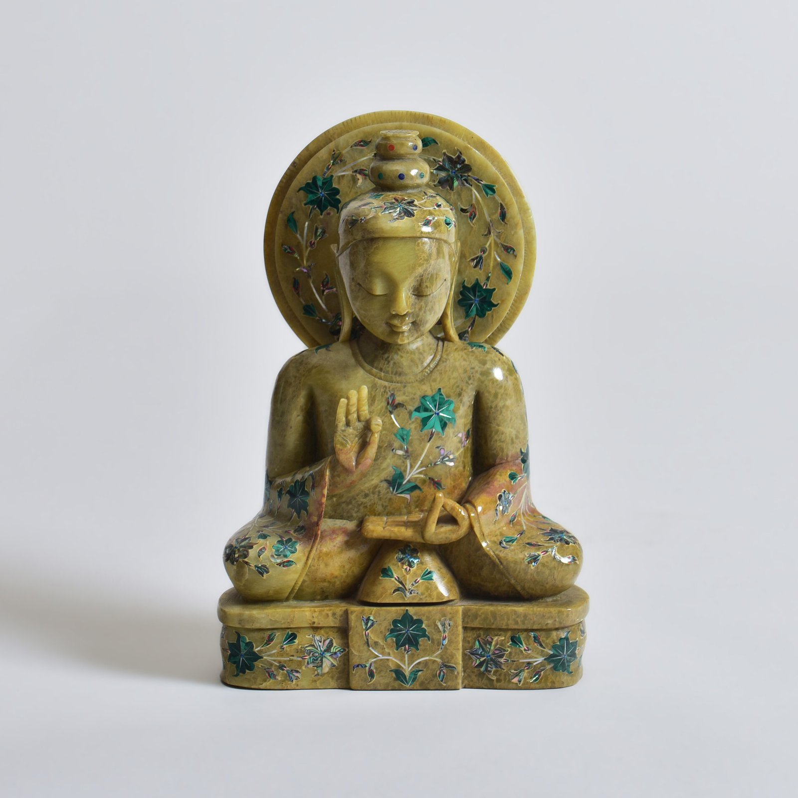Nestled in a moment of quiet teaching, this brown marble Buddha holds the Vitarka Mudra, an eternal gesture of wisdom and gentle guidance. Each semi-precious stone, delicately inlaid with the ancient Parchinkari technique, catches the light like whispers of a forgotten story. More than a sculpture, it is a silent guardian of your home’s calm, inviting stillness to bloom in your heart.