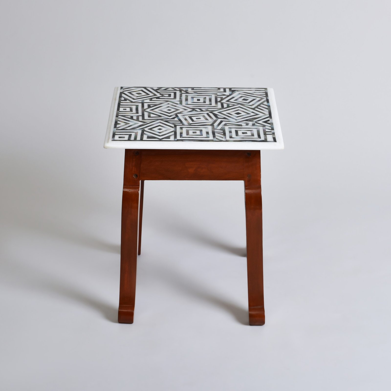 Crafted from pristine white marble, this square side table is a harmony of geometry and grace. Delicate inlays of semi-precious stones form a mesmerising pattern of abstract squares, each one echoing the next like ripples in a still pond. Using the age-old Parchinkari technique, artisans bring to life a modern rhythm within a timeless form.