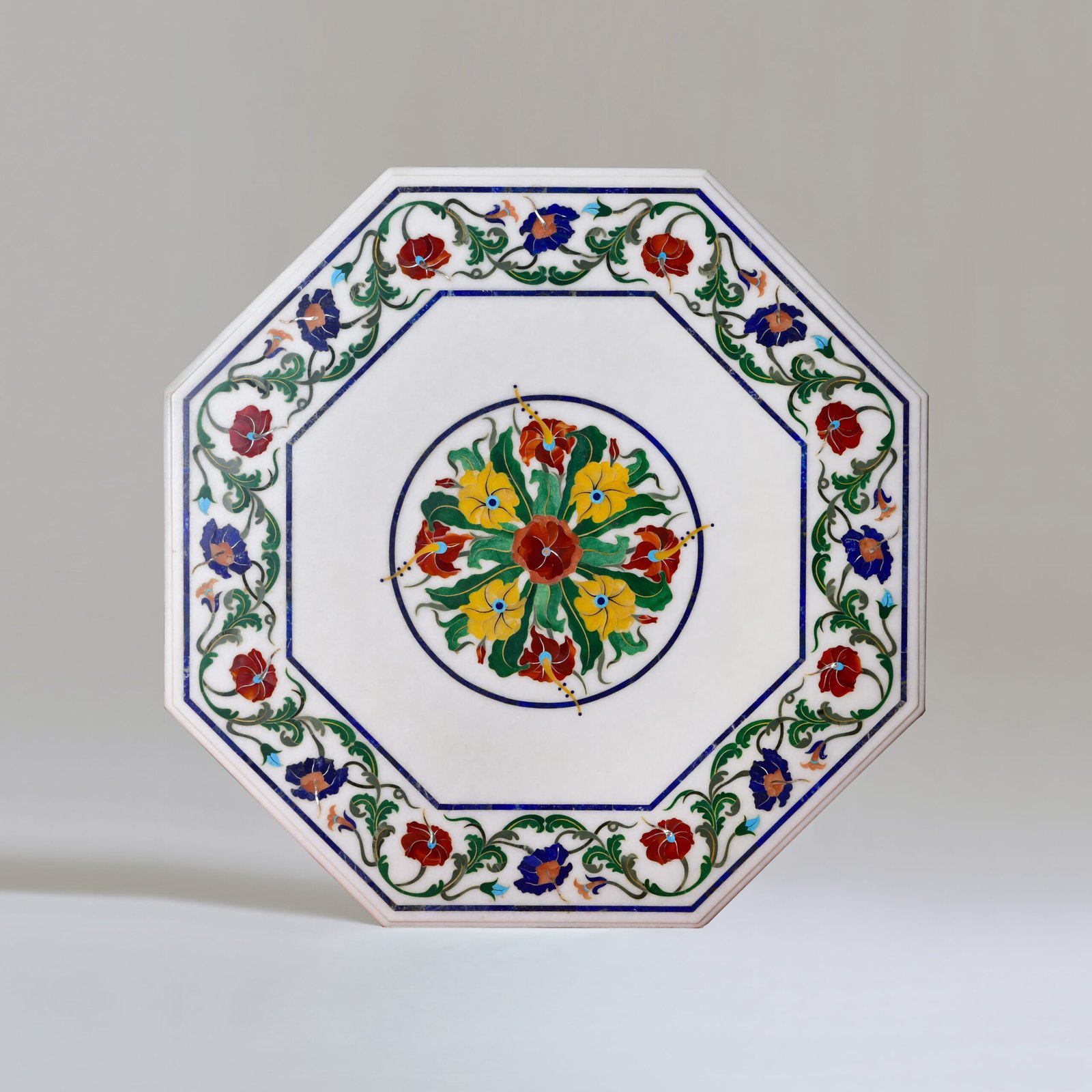 In the quiet elegance of its hexagonal form, this white marble table tells a story of timeless craft. Hand-inlaid with traditional floral motifs using the centuries-old Parchinkari technique, each petal and vine is shaped from semi-precious stones, whispers of jade, lapis, and coral resting in luminous stone.