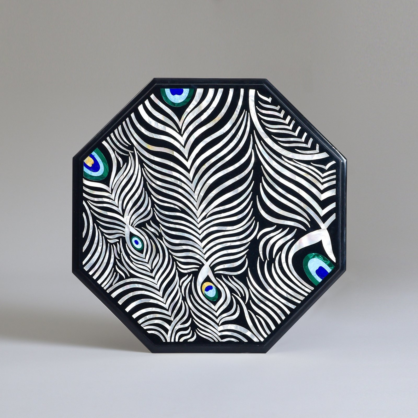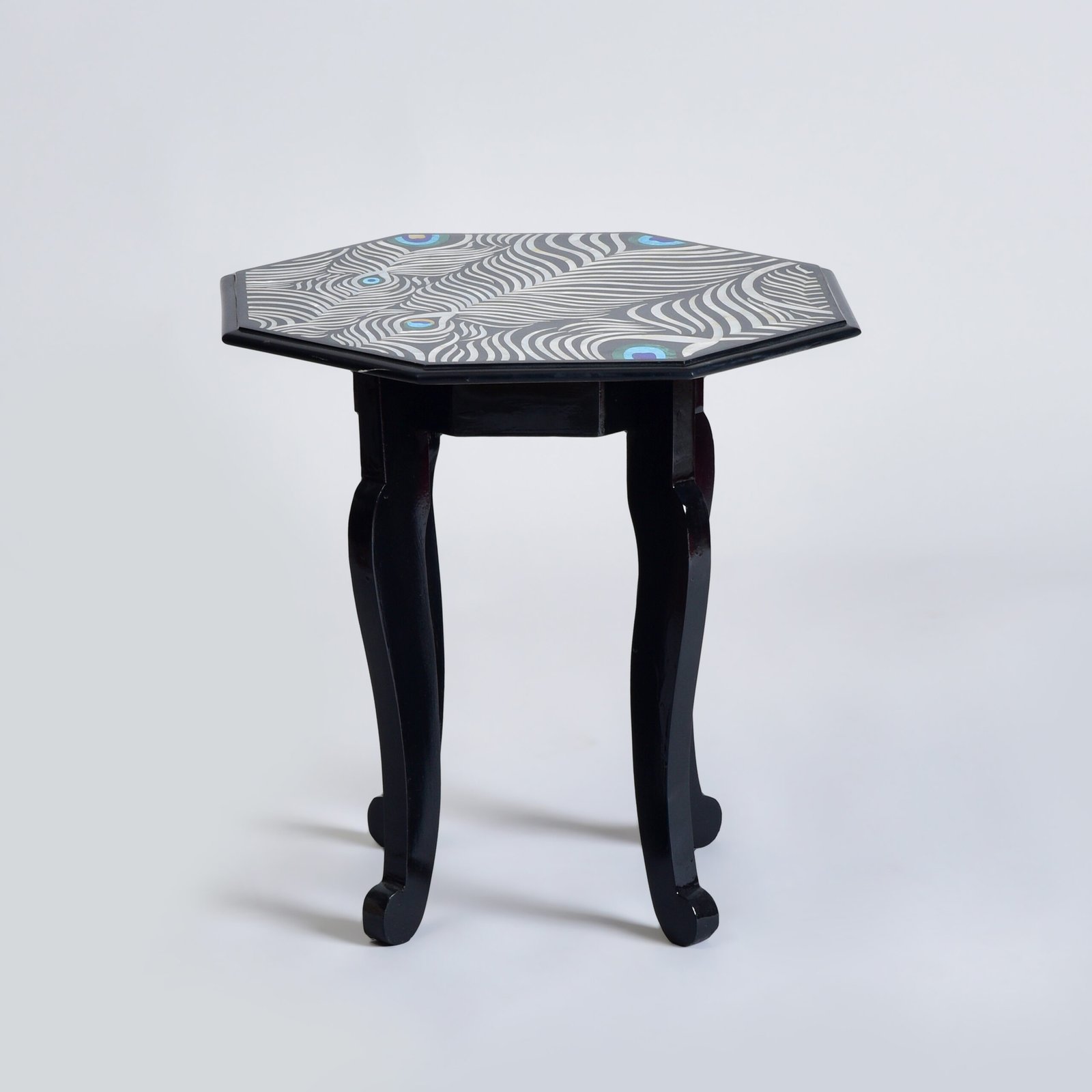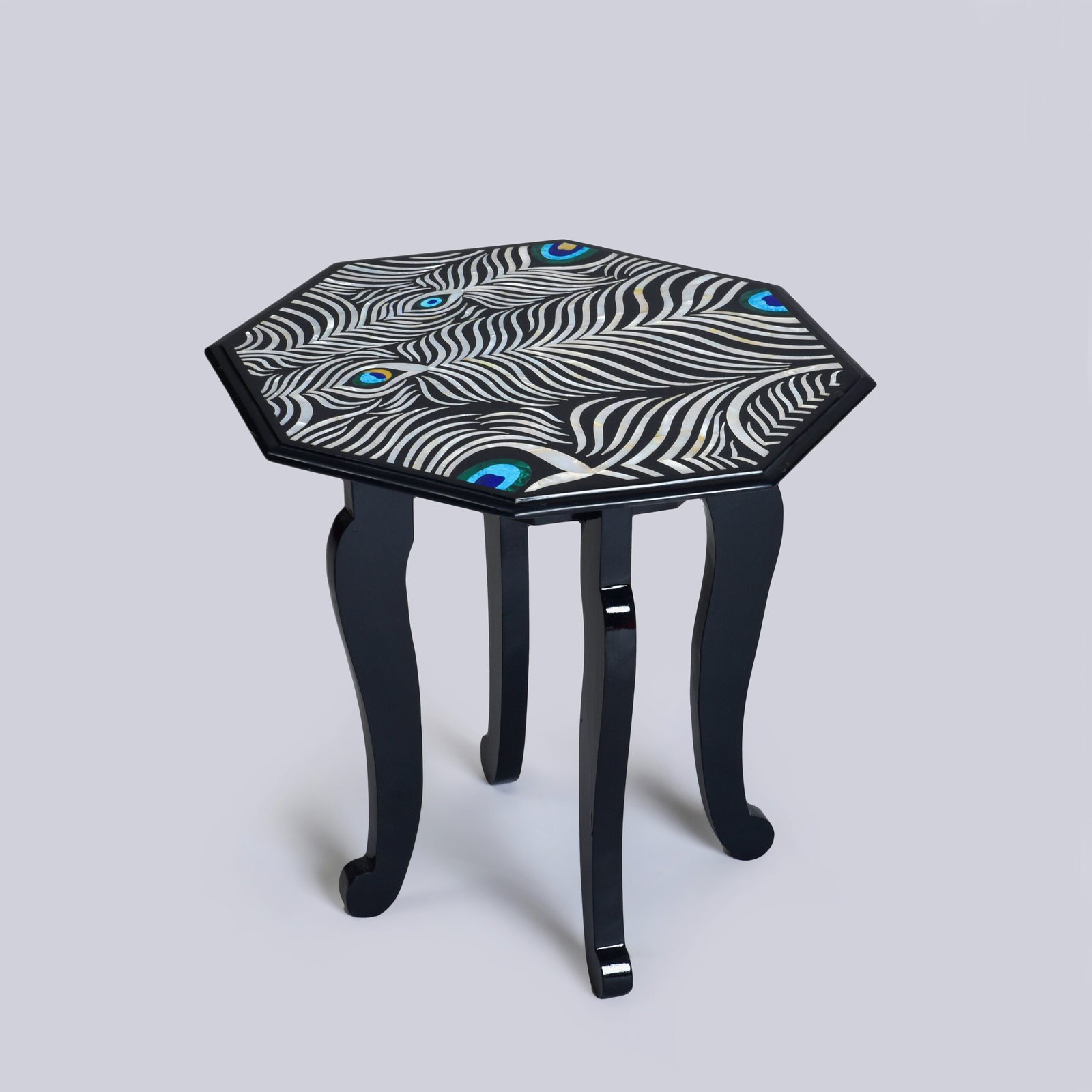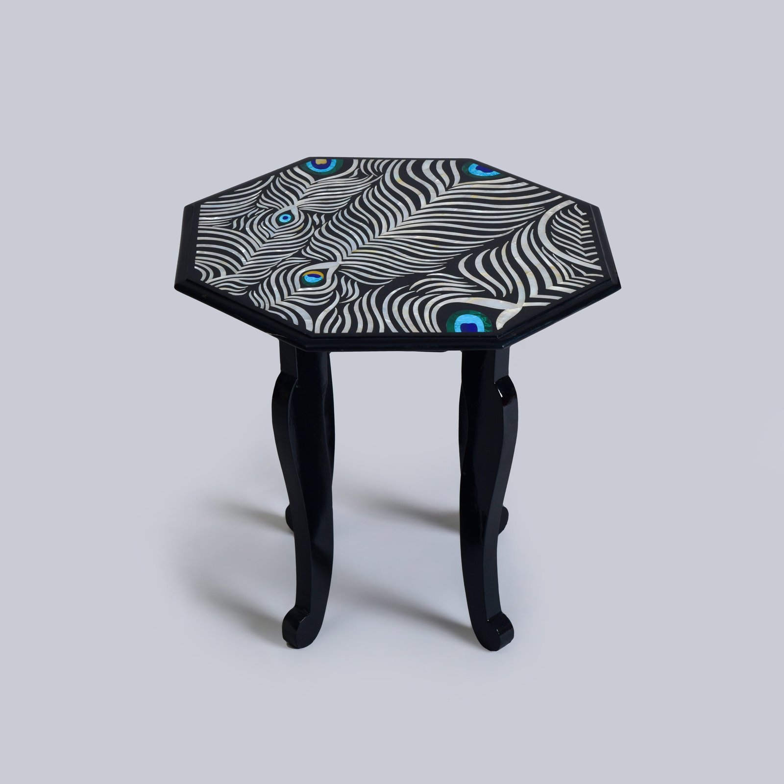 A tribute to timeless splendour, this table draws its soul from the majestic peacock, nature’s most graceful muse. Across the surface, stylised feathers unfurl in rhythmic patterns, each crafted with painstaking precision using the ancient Parchinkari technique. Semi-precious stones shimmer inlaid within the marble, catching light like droplets on silk, each hue layered to echo the iridescence of the bird itself. The pattern arcs outward in quiet grandeur, evoking both regal tradition and delicate movement. This coffe and side table elevates the everyday with a quiet sense of celebration and legacy.