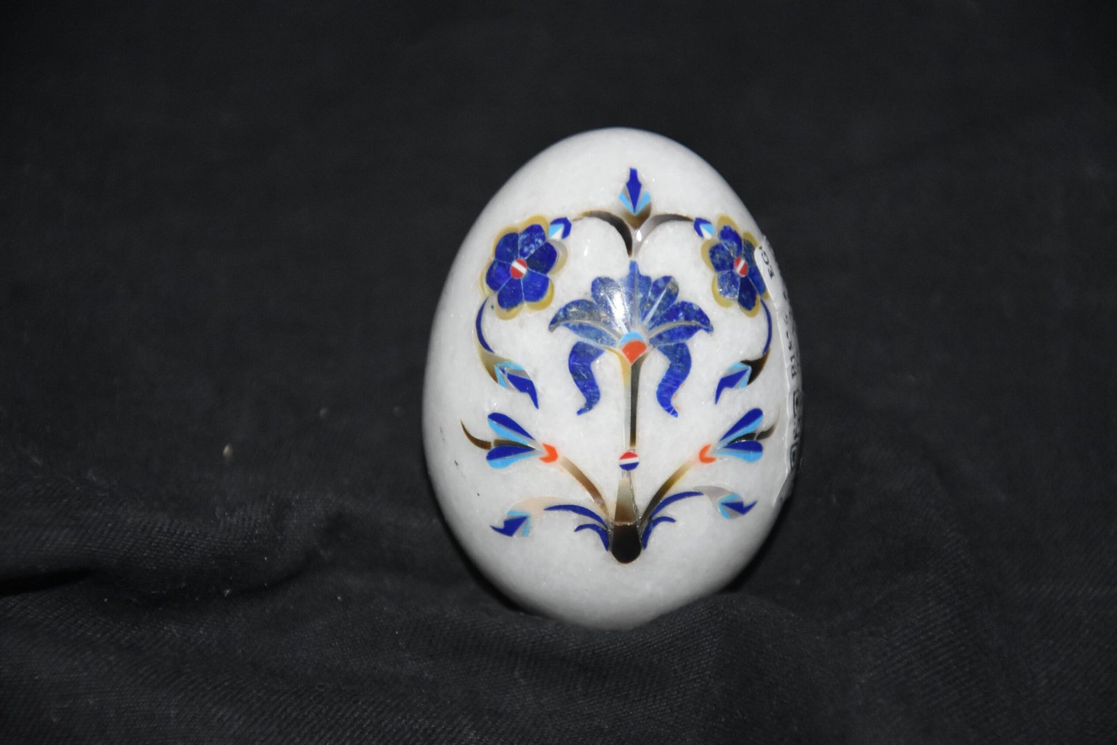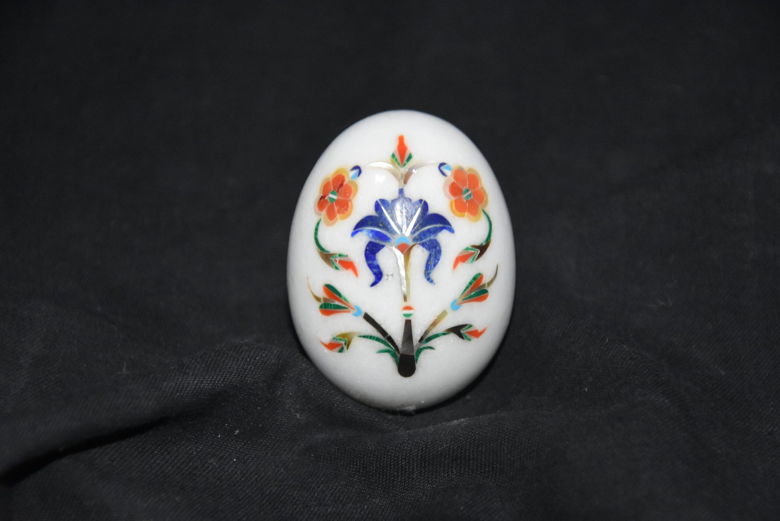 Carved from luminous white marble, these Easter eggs bloom with delicate florals shaped through the ancient art of Parchinkari. Petals, leaves, and tendrils of semi-precious stones are inlaid by hand, forming gardens that seem to awaken at dawn. Each egg rests cool and serene in the palm, yet carries a quiet brilliance that catches light like spring rain. Created for collectors and dreamers alike, this set transforms any home into a sanctuary of renewal, grace, and celebration during Easter gatherings.