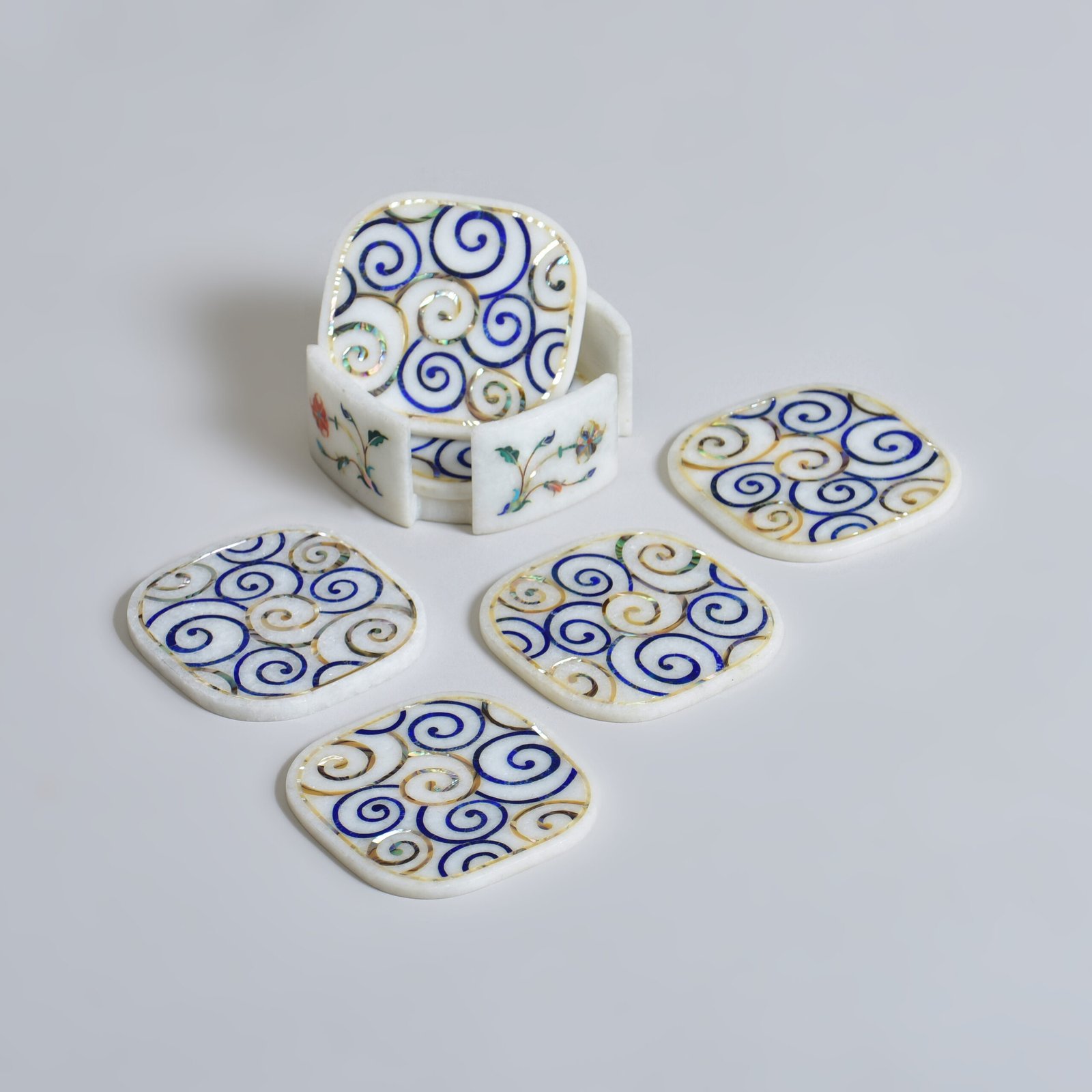 Crafted from pristine marble using the timeless Parchinkari technique, this coaster set is a quiet ode to elegance and heritage. Each coaster is adorned with delicate blue and golden spirals, fluid, graceful forms that echo the rhythm of ocean waves, meticulously brought to life with inlaid semi-precious stones.